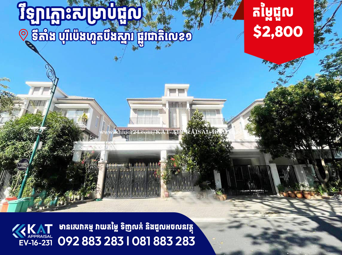 វីឡាភ្លោះសម្រាប់ជួល l Twin A For Rent -តម្លៃជួល l Rent price : $2,800 -ទំហំផ្ទះ | House Size : 6m x 12m -បន្ទប់គេង | Bedroom: 04 -បន្ទប់ទឹក | Bathroom: 05 - ទីតាំង | Location៖ បុរីប៉េងហួត បឹងស្នោរ សង្កាត់និរោធន៍, ខណ្ឌច្បារអំពៅ Tel: 092883xxxClick To Call l 081883xxxClick To Call Telegram Chat : https://t.me/katappraisalsupport Telegram Channel : https://t.me/KAT_APPRAISAL
