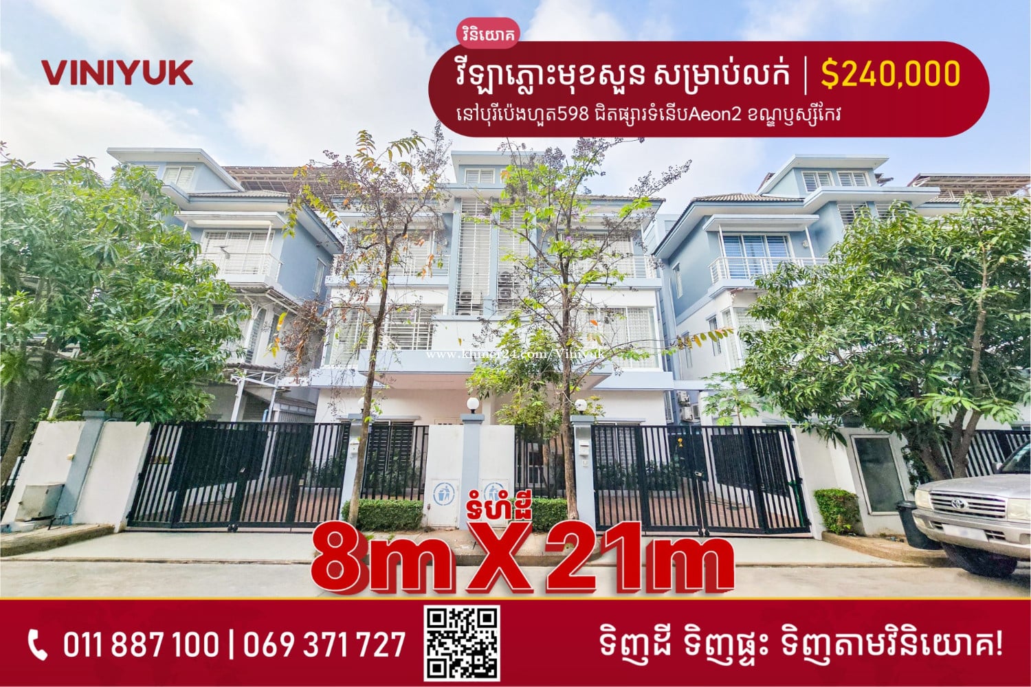 🏡វីឡាភ្លោះ មុខសួន សម្រាប់លក់!! 📍ទីតាំង ៖ នៅបុរីប៉េងហួត 598 ជិតផ្សារទំនើប Aeon 2 ខណ្ឌឬស្សីកែវ - តម្លៃលក់: $240,000 ចរចា - ទំហំដី : 8m x 21m - ទំហំផ្ទះ : 6m x 12m - បន្ទប់គេង 4 , បន្ទប់ទឹក 5 - ផ្ទះបាយ 1 , កន្លែងទទួលភ្ញៀវ 1 - ប្លង់ រឹង - ទិសបែរខាង កើត - លេខអាជ្ញាប័ណ្ណ : E-22-404