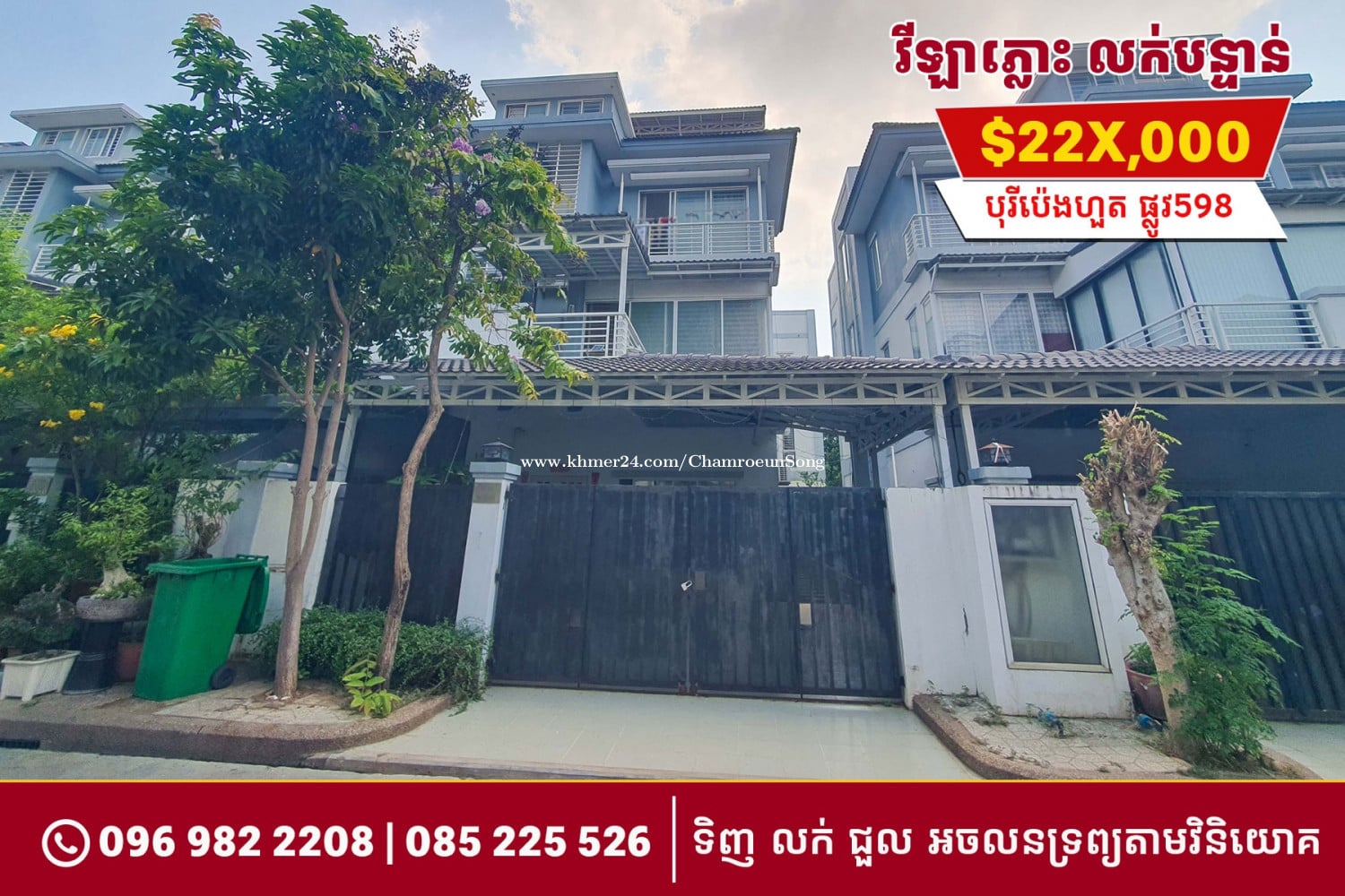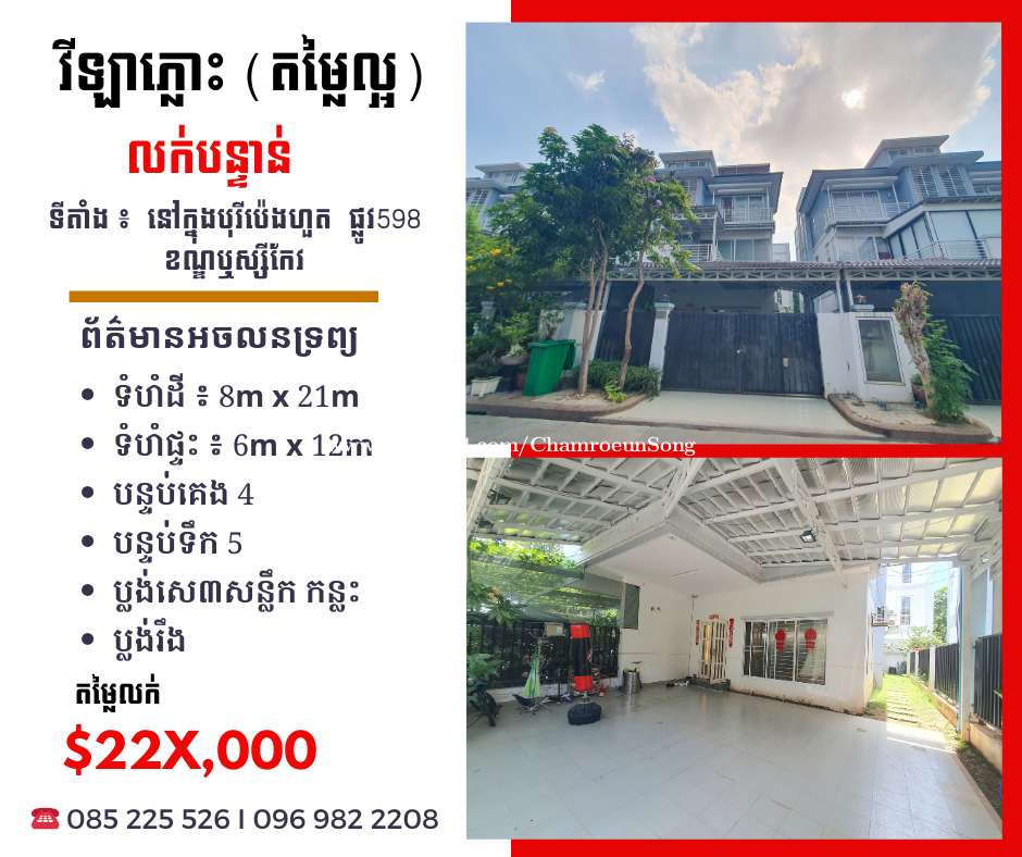ផ្ទះវីឡាភ្លោះ លក់បន្ទាន់!! 📍ទីតាំង: នៅក្នុងបុរីប៉េងហួត ដឹស្តាព្រីមៀរ៍ ផ្លូវ598 ខណ្ឌឬស្សីកែវ - តម្លៃលក់ : $22X,000 ចរចា - ទំហំដី : 8m x 21m - ទំហំផ្ទះ : 6m x 12m - បន្ទប់គេង 4 , បន្ទប់ទឹក 5 - ផ្ទះបាយ 1 , កន្លែងទទួលភ្ញៀវ 1 - ប្លង់រឹង - លេខអាជ្ញាប័ណ្ណ : E-22-404 ☎️សូមធ្វើការទំនាក់ទំនង៖ 0969822xxxClick To Call | 085225xxxClick To Call Telegram: https://t.me/Chamroeun_Song សូមអរគុណ!!