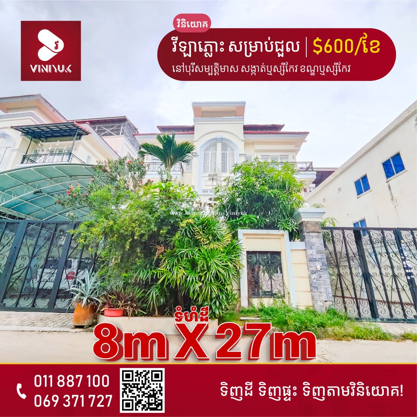 🏡វីឡាភ្លោះ សម្រាប់ជួល!! 📍ទីតាំង៖ នៅបុរីសម្បត្តិមាស ភូមិបឹងសាឡាង សង្កាត់ឬស្សីកែវ ខណ្ឌឬស្សីកែវ រាជធានីភ្នំពេញ - តម្លៃជួល: $600/ខែ ចរចា - ទំហំដី: 8m x 27m ,ដីមុខ9m,ដីក្រោយ6m,ចម្ហៀង2m - ទំហំផ្ទះ: 6m x 12m - បន្ទប់គេង4, បន្ទប់ទឹក5 - ទិស ត្បូង - សម្ភារៈ ម៉ាសុីនត្រជាក់3,គ្រែ2,សាឡុង1 - ក្បែរផ្សារបឹងសាឡាងត្រឹម300mនិង5នាទីពីស្ពានបាឡេ - លេខអាជ្ញាប័ណ្ណ : E-22-404 📲សូមធ្វើការទំនាក់ទំនង ៖ 011887xxxClick To Call | 069371xxxClick To Call