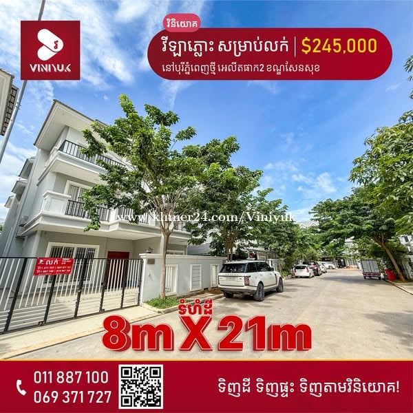 🏡វីឡាភ្លោះ សម្រាប់លក់!! 📍ទីតាំង ៖ នៅបុរីភ្នំពេញថ្មី អេលីតផាក2 ខណ្ឌសែនសុខ - តម្លៃលក់ : $245,000 ចរចា - ទំហំផ្ទះ ៖ 6m x 12m - ទំហំដី ៖ 8m x 21m - បន្ទប់គេង 4 , បន្ទប់ទឹក 6 - ផ្ទះបាយ 1 , កន្លែងទទួលភ្ញៀវ 1 - ផ្ទះថ្មីស្អាត - ផ្ទេរសិទ្ធិត្រឹមបុរី - លេខអាជ្ញាប័ណ្ណ : E-22-404