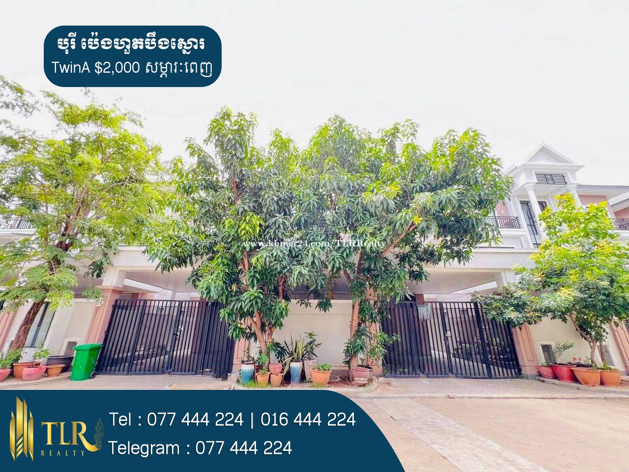 🏡វីឡាភ្លោះ A ពីរជាប់គ្នាសម្រាប់ជួល |Two Villas Twin A for Rent 💲តម្លៃជួល | Price Rent : $2,000 - សម្ភារៈ | Furniture : Fully Furnished - ទំហំផ្ទះ | House size : 6m x 12m - ទំហំដី | Land size : 8m x 22m - បន្ទប់គេង | Bedroom : 4 - បន្ទប់ទឹក | Bathroom : 5 - ផ្ទះបាយ | Kitchen : 1 - បន្ទប់ទទួលភ្ញៀវ | Livingroom 1 - ផ្ទះបែរទៅខាងលិច | Facing to West 📍ទីតាំងស្ថិតនៅក្នុង បុរីប៉េងហួតបឹងស្នោរ គម្រោងយូរ៉ូវីល សង្កាត់និរោធ ខណ្ឌច្បារអំពៅ រាជធានីភ្នំពេញ | Location in Borey Peng Huoth Beoung Snor Phnom Penh. # អត្តលេខអាជ្ញាប័ណ្ណ : E-24-449 📞 Cellcard : 077444xxxClick To Call 📞 Smart : 016444xxxClick To Call 📞 Metfone : 066444xxxClick To Call 📱 Telegram : 077444xxxClick To Call 📱 Channel telegram : https://t.me/RithyTLR