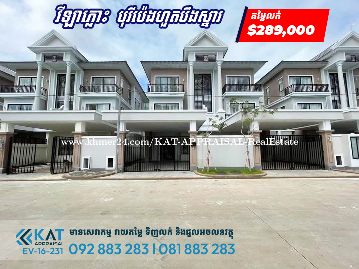 វីឡាភ្លោះAលក់បន្ទាន់ / Twin Villa For Sale (Roseville) -តម្លៃលក់ l Sale price : $289,000 -ទំហំផ្ទះ l House Size: 6m x 12m -ទំហំដី l Land Size: 7.7 x 23m -បន្ទប់គេង4 / បន្ទប់ទឹក5 -ផ្ទេរឈ្មោះត្រឹមបុរី Tel: 092883xxxClick To Call l 081883xxxClick To Call Telegram Chat : https://t.me/katappraisalsupport Telegram Channel : https://t.me/KAT_APPRAISAL