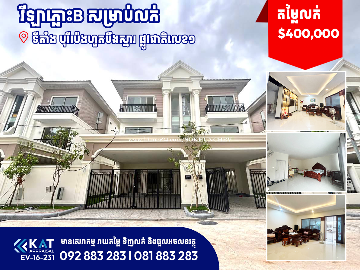 វីឡាភ្លោះB សម្រាប់លក់ l Twin Villa B For sale -គម្រោង Eco Poli 1 -តម្លៃចរចា | Asking Price :$400,000 -ទំហំដី | Land Size : 8.1mx25m -ទំហំផ្ទះ | House Size : 6m x 16.8m -បន្ទប់គេង | Bedroom: 04 -បន្ទប់ទឹក | Bathroom: 05 -ឯកសារត្រឹម បុរី -ទីតាំង/ Location៖ បុរីប៉េងហួតបឹងស្នោរ សង្កាត់វាលស្បូវ , ខណ្ឌច្បារអំពៅ Tel: 092883xxxClick To Call l 081883xxxClick To Call Telegram Chat : https://t.me/katappraisalsupport Telegram Channel : https://t.me/KAT_APPRAISAL
