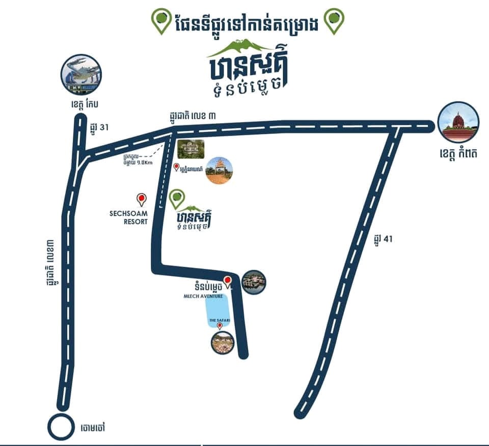 Kampot , 🚩 ទីតាំង៖ផ្លូវចូលរមណីយដ្ឋាន ទំនប់ម្លេច ខេត្តកំពត ( ខ្លោងទ្វារ សកលវិទ្យាល័យ ភូមិន្ទ តាកែវ-កំពត ) ចុះពីផ្លូវជាតិលេខ ៣ (គីឡូទី 96 ) ចំងាយ 1500ម https://maps.app.goo.gl/o1TojUgCtwGwm16AA?g_st=ic