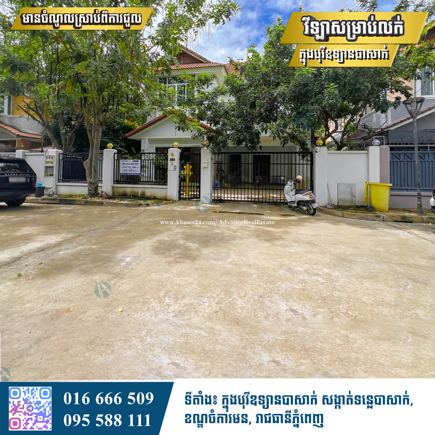 🔊 វីឡាសម្រាប់លក់ (ក្នុងបុរីឧទ្យាបាសាក់) ✅ មានចំណូលស្រាប់ពីការជួល ✅ ទំហំដី៖ 14m x 20m (ប្លង់រឹង) ✅ ទំហំផ្ទះ 10m x 12m (ពីរជាន់) ✅ មាន 4បន្ទប់គេង និង 5បន្ទប់ទឹក 📍 ក្នុងបុរីឧទ្យានបាសាក់ សង្កាត់ទន្លេបាសាក់, ខណ្ឌចំការមន. រាជធានីភ្នំពេញ. - លេខអាជ្ញាបណ្ណភ្នាក់ងារអចលនវត្ថុ : EV-17-244 📞សម្រាប់ព័ត៌មានបន្ថែមសូមទំនាក់ទំនង : 016666xxxClick To Call / 095588xxxClick To Call Telegram:៖ https://t.me/sophoeurk_phim