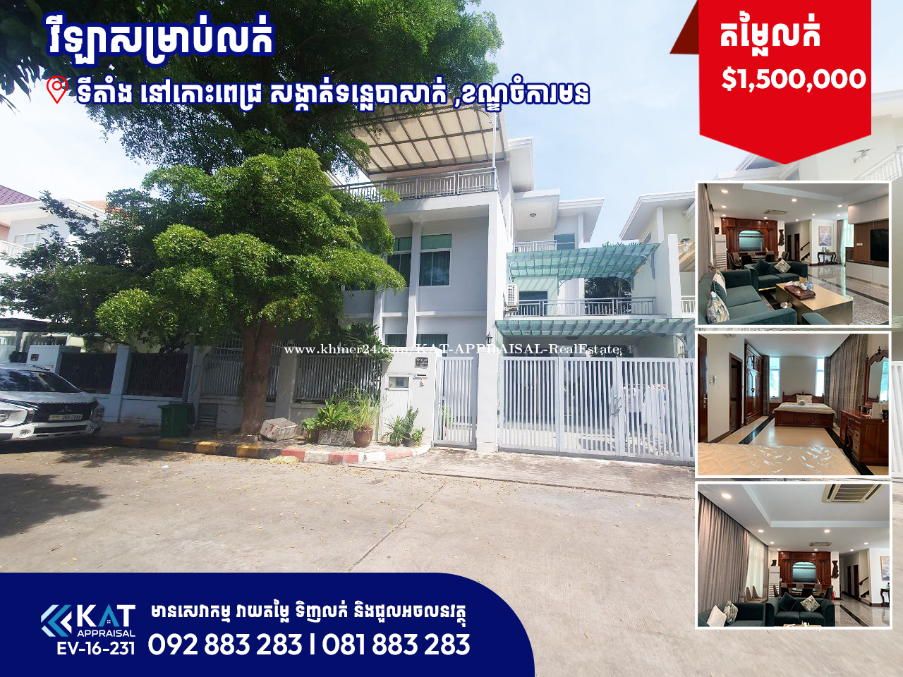 វីឡាសម្រាប់លក់ | Villa For Sale -តម្លៃលក់ | Sale Price: $1,500,000 ចរចា - ប្លង់រឹង | Hard Title Transfer -ទំហំផ្ទះ | House Size: 8m × 15m -ទំហំដី | Land Size: 13m × 20m - បន្ទប់គេង | Bedroom: 5 - បន្ទប់ទឹក | Bathroom: 6 -ចំនួនជាន់ | Floor Status: 3 - សំភារៈមានពេញ l Furniture have Full -ទីតាំង/ Location: នៅកោះពេជ្រ សង្កាត់ទន្លេបាសាក់ ,ខណ្ឌចំការមន , រាជធានីភ្នំពេញ។ Tel: 092883xxxClick To Call l 081883xxxClick To Call Telegram Chat : https://t.me/katappraisalsupport Telegram Channel : https://t.me/KAT_APPRAISAL