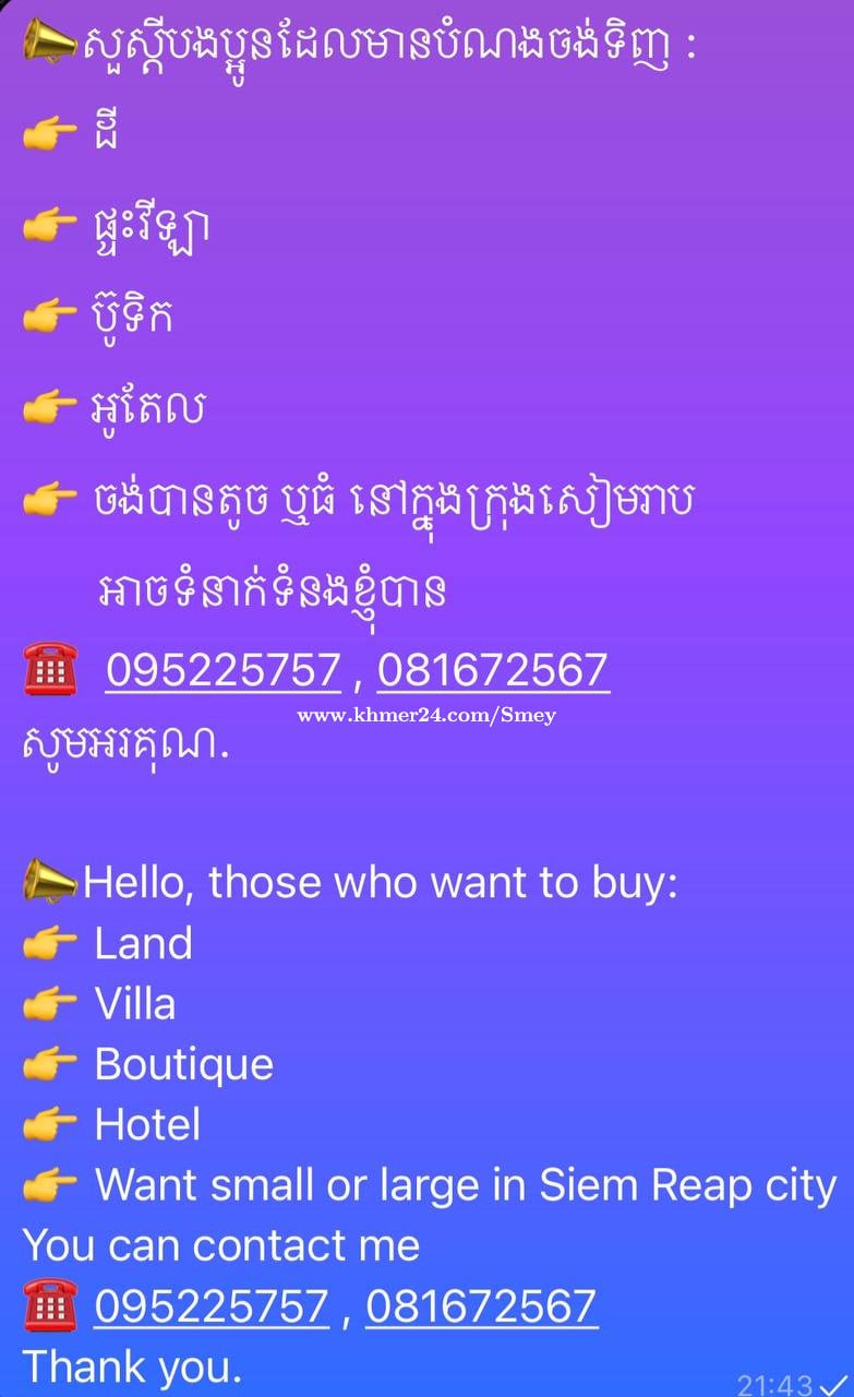 សណ្ឋាគារលក់កណ្តាលក្រុងសៀមរាប -មាន 31បន្ទប់ -មាអាងហែលទឹក -រួបញ្ចូលទាំងសម្ភារៈក្នុងសណ្ឋាគារទាំងអស់ -ប្លង់រឹង -តម្លៃមហាធូរ អាចចរចារបាន Telegram: +85595225xxxClick To Call សូមអរគុណ. Hotel for sale in the center of Siem Reap -31 rooms -Swimming pool -All hotel facilities included -Fixed title -Very affordable price, negotiable Telegram: +85595225xxxClick To Call Thanks.