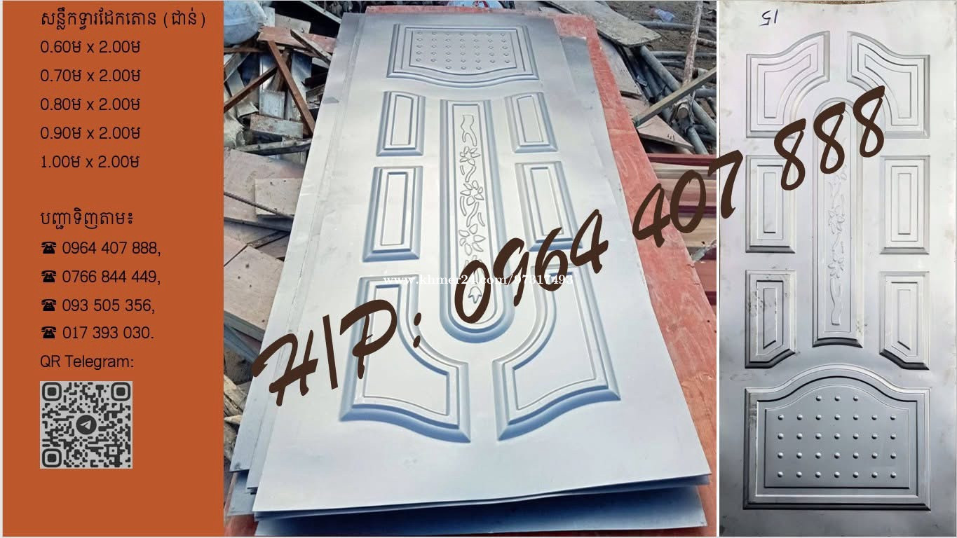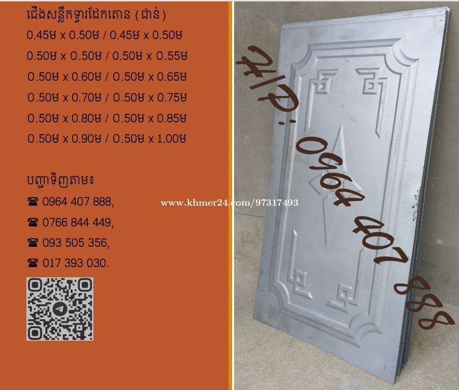 សន្លឹកទ្វារខ្នាត : 0.60 x 2.00m 0.70 x 2.00m 0.80 x 2.00m 0.90 x 2.00m 1.00 x 2.00m ជើងសន្លឹកខ្នាត: 0.40 x 0.50m 0.45 x 0.50m 0.50 x 0.50m 0.50 x 0.55m 0.50 x 0.60m 0.50 x 0.65m 0.50 x 0.70m 0.50 x 0.75m 0.50 x 0.80m 0.50 x 0.85m 0.50 x 0.90m 0.50 x 1.00m
