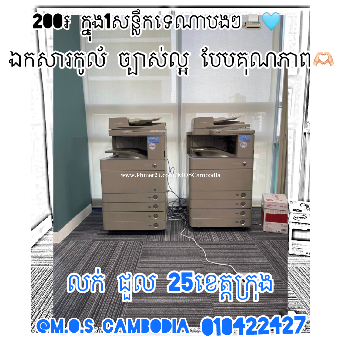 *ការផ្តល់ជូន ពីការជួលហ្វូតូកូបពី * មានម៉ាស៊ីនហ្វូតូកូបពី១គ្រឿង (តាមតម្រូវការ ) * ក្នុង១ខែអាចប្រើប្រាស់បាន 2,000ផេក * កូបពី ព្រី កូល័រ)A3,A4,A5 * ដឹកជញ្ជូប ដល់ទីតាំង (ហ្វ្រី) * IT តម្លើងព្រីនស្កែន( ហ្វ្រី) * ទឹកថ្នាំ គ្រឿងបន្លាស់ផ្សេងៗ (ហ្វ្រីគ្រប់មុខ) * បញ្ចុះតម្លៃ50%(តម្លៃដើមខែទី១) * សូមបញ្ចាក់ថា ក្រដាស់សម្រាប់ព្រីនឯកសារ ខាងយើងមិនផ្តល់ជូនទេ