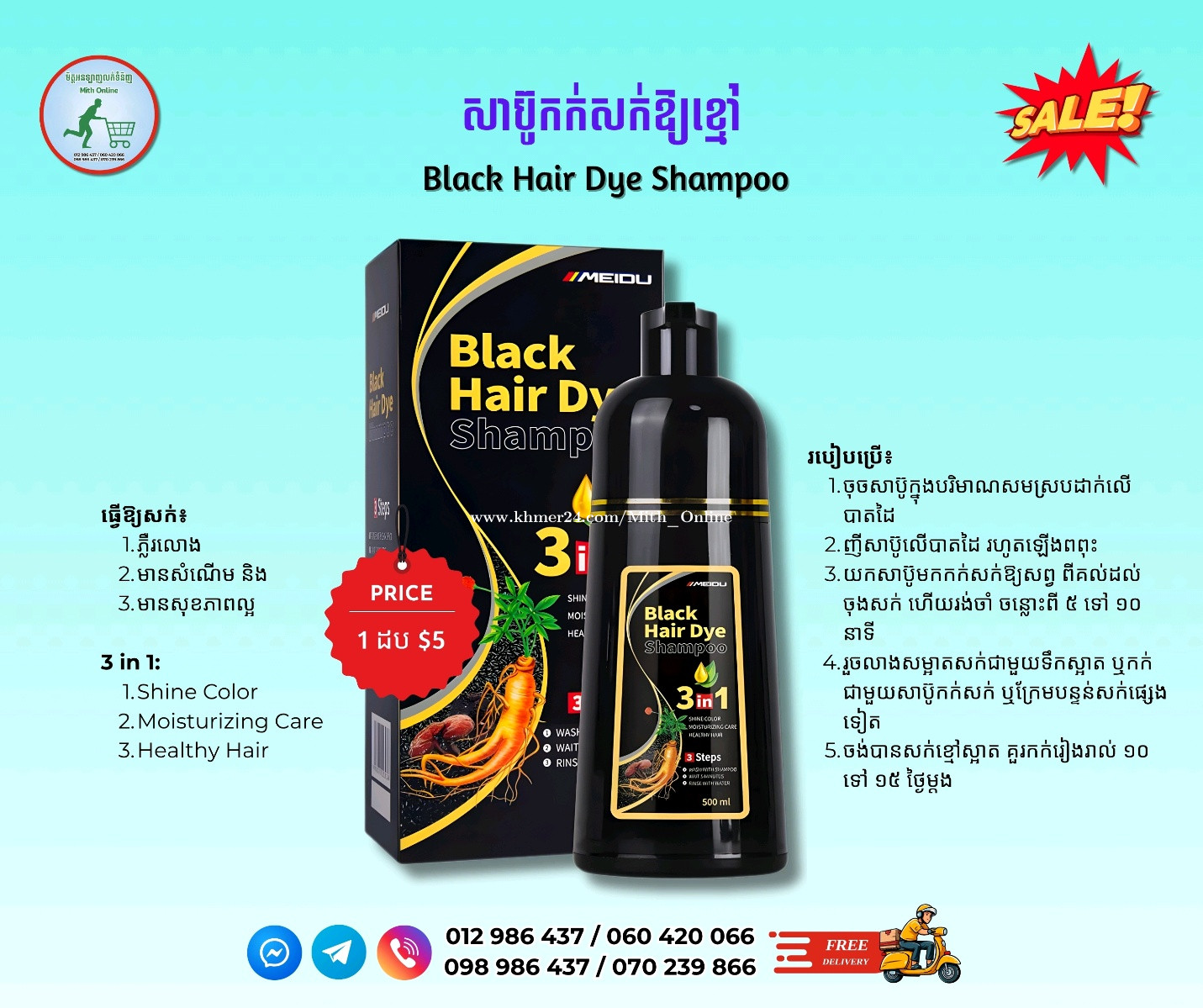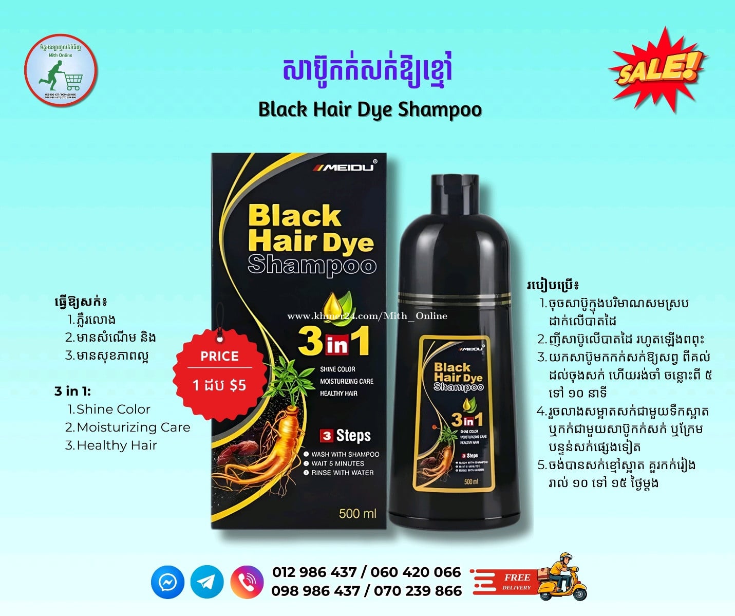 📢 សាប៊ូកក់សក់ស្កូវឱ្យខ្មៅ♠️ ☑️ចំណុះ 500ml 💰 មួយដបតម្លៃ $5 📦 ដឹកជញ្ជូនឥតគិតថ្លៃ Free Delivery ☎️ 012986xxxClick To Call / 060420xxxClick To Call ☎️ 098986xxxClick To Call