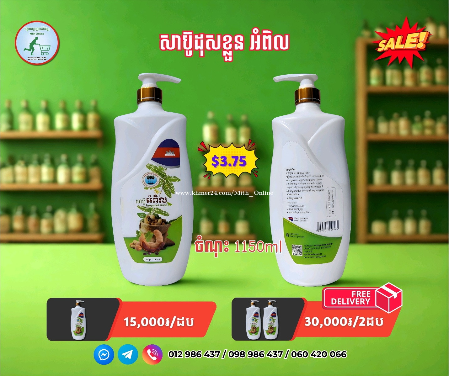🚿សាប៊ូដុសខ្លួនអំពិល ផលិតផលខ្មែរ 🚿Tamarind Soap, Khmer Product ☑️ចំណុះ 1150ml 💰$3.75 ឬ 15,000៛ 📦ទិញ២ដប ហ្រ្វ៊ីដឹក (buy two, free delivery) ☎️012986xxxClick To Call ☎️098986xxxClick To Call ☎️060420xxxClick To Call