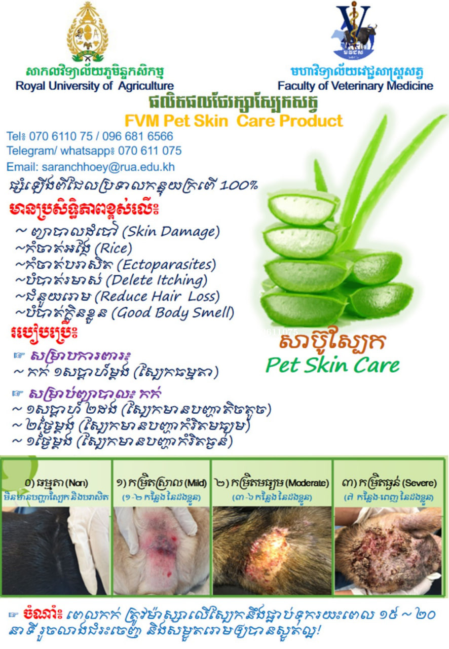 ផ្សំឡើងពីជែលប្រទាលកន្ទុយក្រពើ 100% -មានប្រសិទ្ធិភាពខ្ពស់លើ៖ ~ ព្យាបាលដំបៅ (Skin Damage) ~កំចាត់អង្កែ (Rice) ~កំចាត់បរាសិត (Ectoparasites) ~បំបាត់រមាស់ (Delete Itching) ~ជំនួយរោម (Reduce Hair Loss) ~បំបាត់ក្លិនខ្លួន (Good Body Smell) -សម្រាបការពារស្បែក៖ របៀបកក់ ~ កក់ ១សប្ដាហ៍ម្ដង (ស្បែកធម្មតា) -សម្រាប់ព្យាបាលបញ្ហាស្បែក៖ របៀបកក់ ~ ១សប្ដាហ៍ ២ដង (ស្បែកមានបញ្ហាតិចតួច) ~ ២ថ្ងៃម្ដង (ស្បែកមានបញ្ហាកំរិតមធ្យម) ~ ១ថ្ងៃម្ដង (ស្បែកមានបញ្ហាកំរិតធ្ងន់) Cost: 5.5$/bottle