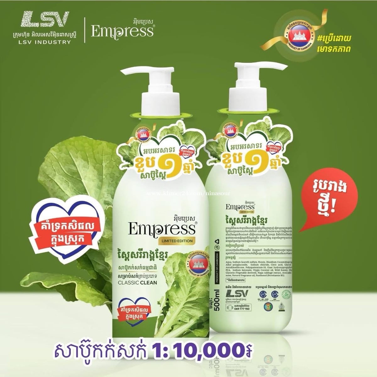 ផលិតផលស្នាដៃកូនខ្មែរ ផលិតផលធម្មជាតិ នៃការដាំដុះរបស់កសិករខ្មែរ ជាមោទនភាពជាតិខ្មែរ ខ្មែរធ្វើបាន 🇰🇭🫶🏻🇰🇭🥬 សាប៊ូស្ពៃក្រញាញ់:✅ សាប៊ូកក់សក់: 10,000៛✅ សាប៊ូដុសខ្លួន: 10,000៛✅ សាប៊ូលាងមុខសរីរាង្គ: 10,000៛✅ សាប៊ូដុសខ្លួនទឹកឃ្មុំព្រៃ(ប្រើជាស្ក្រាប់បាន): 16,000៛✅ សាប៊ូលាងចាន 1,2 លីត្រ: 5,000៛✅ សាប៊ូលាងចាន 3,5 លីត្រ: 12,000៛🛵💨 តម្លៃដឹកជញ្ជូន 5,000៛ គ្រប់ទីតាំងនៅក្នុងក្រុងTelegram: https://t.me/Nanalin_online_shop