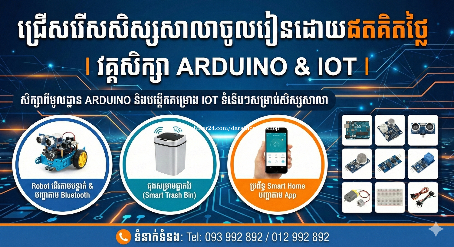 យើងខ្ញុំចង់ចែករំលែកចំណេះដឹងផ្នែកវិទ្យាសាស្ត្រដល់សិស្សានុសិស្សចាប់ពីថ្នាក់ទី ៩ ដល់ ១១ ដែលចូលចិត្តចង់ចេះ និងចង់ដឹងពីផ្នែក Robotic ។ យើងខ្ញុំនឹងបង្រៀនដោយឥតគិតថ្លៃចំពោះសិស្សណាដែលមិនលទ្ធភាពសិក្សាវគ្គនេះ។ -> រយៈពេលសិក្សា៖ ១២ សប្តាហ៍ (២៤ ម៉ោង) -> ពេលវេលា៖ រៀងរាល់ថ្ងៃអាទិត្យ ពេលព្រឹក ចាប់ពីម៉ោង 9:00 ដល់ 11:00 ។ -> សម្ភារសិក្សា៖ សិស្សត្រូវមាន កុំព្យូរទ័រយួរដៃ (Computer Laptop ) និង សេវាអិនធើណេត (សម្រាប់ពេលេរៀន និងការអនុវត្តនៅផ្ទះ ) ។ -> តម្រូវការមូលដ្ឋាន៖ ភាសាអង់គ្លេស និង មិនទាមទារចំណេះដឹងសរសេរកូដពីមុនមកទេ -> ចំនួនសិស្ស៖ ៦ នាក់ក្នុង១ក្រុម ។ Tel: 093992xxxClick To Call ( Telegram )