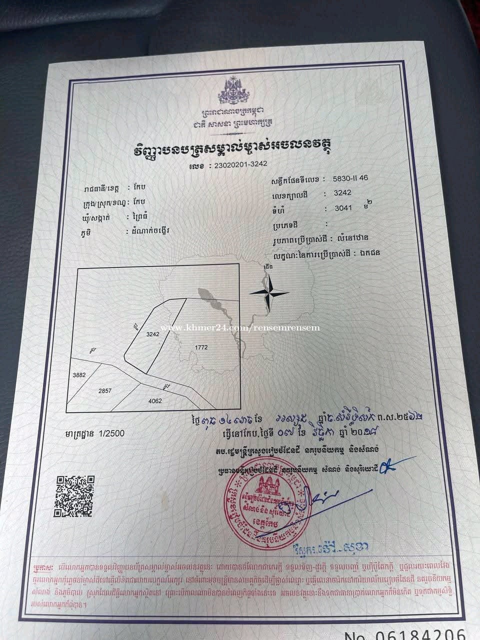 សួស្តីបាទ ខ្ញុំសូមបង្ហាញទីតាំងដីលក់មួយកន្លែងដែលឋិតនៅខេត្ត កែប ឃុំ សង្កាត់ព្រៃ ភូមិ ដំណាក់ចង្អែរ មានចម្ងាយពីផ្សារដំណាក់ចង្អើរត្រឹមមួយគីឡូម៉ែត្រទេបាទ បាទតម្លៃលក់ពីមុន.58000$,តម្លៃលក់ពេលនេះម្ចាស់បន្ទាន់លុយ.55000$ចរចាទេបាទ.លេខទូរសព្ទទំនាក់ទំនងខ្ញុំបាទ.0883287xxxClick To Call.ជាលេខតេឡេក្រាមខ្ញុំបាទ.....