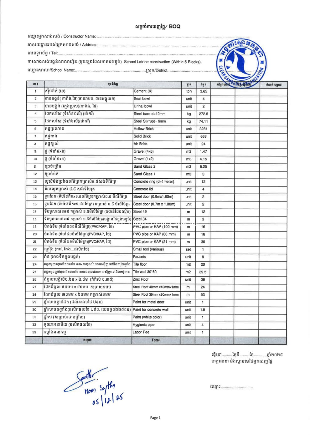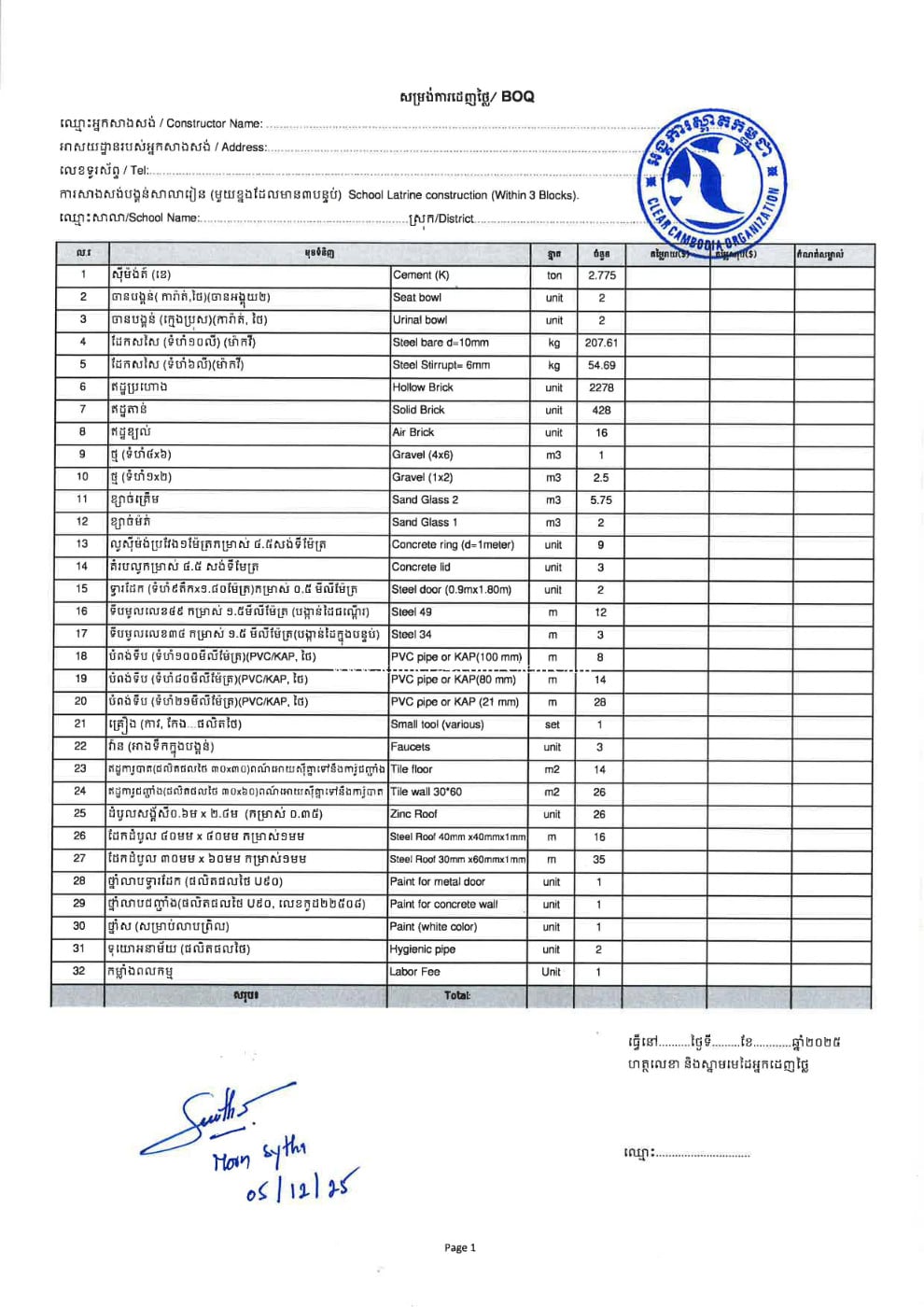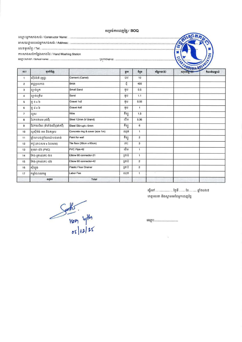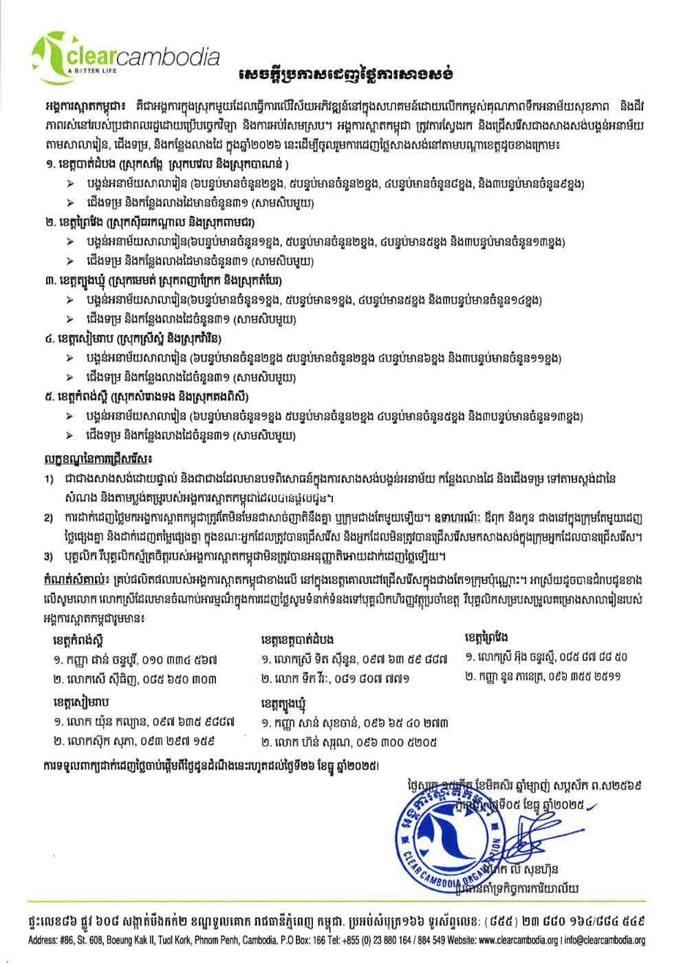 អង្គការស្អាតកម្ពុជា៖ គឺជាអង្គការក្នុងស្រុកមួយដែលធ្វើការលើវិស័យអភិវឌ្ឍន៍នៅក្នុងសហគមន៍ដោយលើកកម្ពស់គុណភាពទឹកអនាម័យសុខភាព និងជីវភាពរស់នៅរបស់ប្រជាពលរដ្ឋដោយប្រើបច្ចេកវិទ្យា និងការអប់រំសមស្រប។ អង្គការស្អាតកម្ពុជា ត្រូវការស្វែងរក និងជ្រើសរើសជាងសាងសង់បង្គន់អនាម័យ តាមសាលារៀន, ជើងទម្រ, និងកន្លែងលាងដៃ ក្នុងឆ្នាំ២០២៦ នេះដើម្បីចូលរួមការដេញថ្លៃសាងសង់នៅតាមបណ្ដាខេត្តដូចខាងក្រោម៖ ១. ខេត្តបាត់ដំបង (ស្រុកសង្កែ ស្រុកបវេល និងស្រុកបាណន់ ) បង្គន់អនាម័យសាលារៀន (៦បន្ទប់មានចំនួន២ខ្នង, ៥បន្ទប់មានចំនួន២ខ្នង, ៤បន្ទប់មានចំនួន៨ខ្នង, និង៣បន្ទប់មានចំនួន៩ខ្នង) ជើងទម្រ និងកន្លែងលាងដៃមានចំនួន៣១ (សាមសិបមួយ) ២. ខេត្តព្រៃវែង (ស្រុកស៊ីធរកណ្ដាល និងស្រុកពាមជរ) បង្គន់អនាម័យសាលារៀន(៦បន្ទប់មានចំនួន១ខ្នង, ៥បន្ទប់មានចំនួន២ខ្នង, ៤បន្ទប់មាន៥ខ្នង និង៣បន្ទប់មានចំនួន១៣ខ្នង) ជើងទម្រ និងកន្លែងលាងដៃមានចំនួន៣១ (សាមសិបមួយ) ៣. ខេត្តត្បូងឃ្មុំ (ស្រុកមេមត់ ស្រុកពញាក្រែក និងស្រុកតំបែរ) បង្គន់អនាម័យសាលារៀន(៦បន្ទប់មានចំនួន១ខ្នង, ៥បន្ទប់មាន១ខ្នង, ៤បន្ទប់មាន៥ខ្នង និង៣បន្ទប់មានចំនួន១៤ខ្នង) ជើងទម្រ និងកន្លែងលាងដៃចំនួន៣១ (សាមសិបមួយ) ៤. ខេត្តសៀមរាប (ស្រុកស្រីស្នំ និងស្រុកវ៉ារិន) បង្គន់អនាម័យសាលារៀន (៦បន្ទប់មានចំនួន២ខ្នង ៥បន្ទប់មានចំនួន២ខ្នង ៤បន្ទប់មាន៦ខ្នង និង៣បន្ទប់មានចំនួន១១ខ្នង) ជើងទម្រ និងកន្លែងលាងដៃចំនួន៣១ (សាមសិបមួយ) ៥. ខេត្តកំពង់ស្ពឺ (ស្រុកសំរោងទង និងស្រុកគងពិសី) បង្គន់អនាម័យសាលារៀន (៦បន្ទប់មានចំនួន១ខ្នង ៥បន្ទប់មានចំនួន២ខ្នង ៤បន្ទប់មានចំនួន៥ខ្នង និង៣បន្ទប់មានចំនួន១៣ខ្នង) ជើងទម្រ និងកន្លែងលាងដៃចំនួន៣១ (សាមសិបមួយ) លក្ខខណ្ឌនៃការជ្រើសរើស៖ 1) ជាជាងសាងសង់ដោយផ្ទាល់ និងជាជាងដែលមានបទពិសោធន៍ក្នុងការសាងសង់បង្គន់អនាម័យ កន្លែងលាងដៃ និងជើងទម្រ ទៅតាមស្តង់ដានៃសំណង និងតាមប្លង់គម្រូរបស់អង្គការស្អាតកម្ពុជាដែលបានផ្ដល់ជូន។ 2) ការដាក់ដេញថ្លៃមកអង្គការស្អាតកម្ពុជាត្រូវតែមិនមែនជាសាច់ញាតិនឹងគ្នា ឬក្រុមជាងតែមួយឡើយ។ ឧទាហរណ៍ៈ ឪពុក និងកូន ជាងនៅក្នុងក្រុមតែមួយដេញថ្លៃផ្សេងគ្នា និងដាក់ដេញតម្លៃផ្សេងគ្នា ក្នុងខណៈអ្នកដែលត្រូវបានជ្រើសរើស និងអ្នកដែលមិនត្រូវបានជ្រើសរើសមកសាងសង់ក្នុងក្រុមអ្នកដែលបានជ្រើសរើស។ 3) បុគ្គលិក រឺបុគ្គលិកស្ម័គ្រចិត្តរបស់អង្គការស្អាតកម្ពុជាមិនត្រូវបានអនុញ្ញាតិអោយដាក់ដេញថ្លៃឡើយ។ កំណត់សំគាល់៖ គ្រប់ផលិតផលរបស់អង្គការស្អាតកម្ពុជាខាងលើ នៅក្នុងខេត្តគោលដៅជ្រើសរើសក្នុងជាងតែ១ក្រុមប៉ុណ្ណោះ។ អាស្រ័យដូចបានជំរាបជូនខាងលើសូមលោក លោកស្រីដែលមានចំណាប់អារម្មណ៏ក