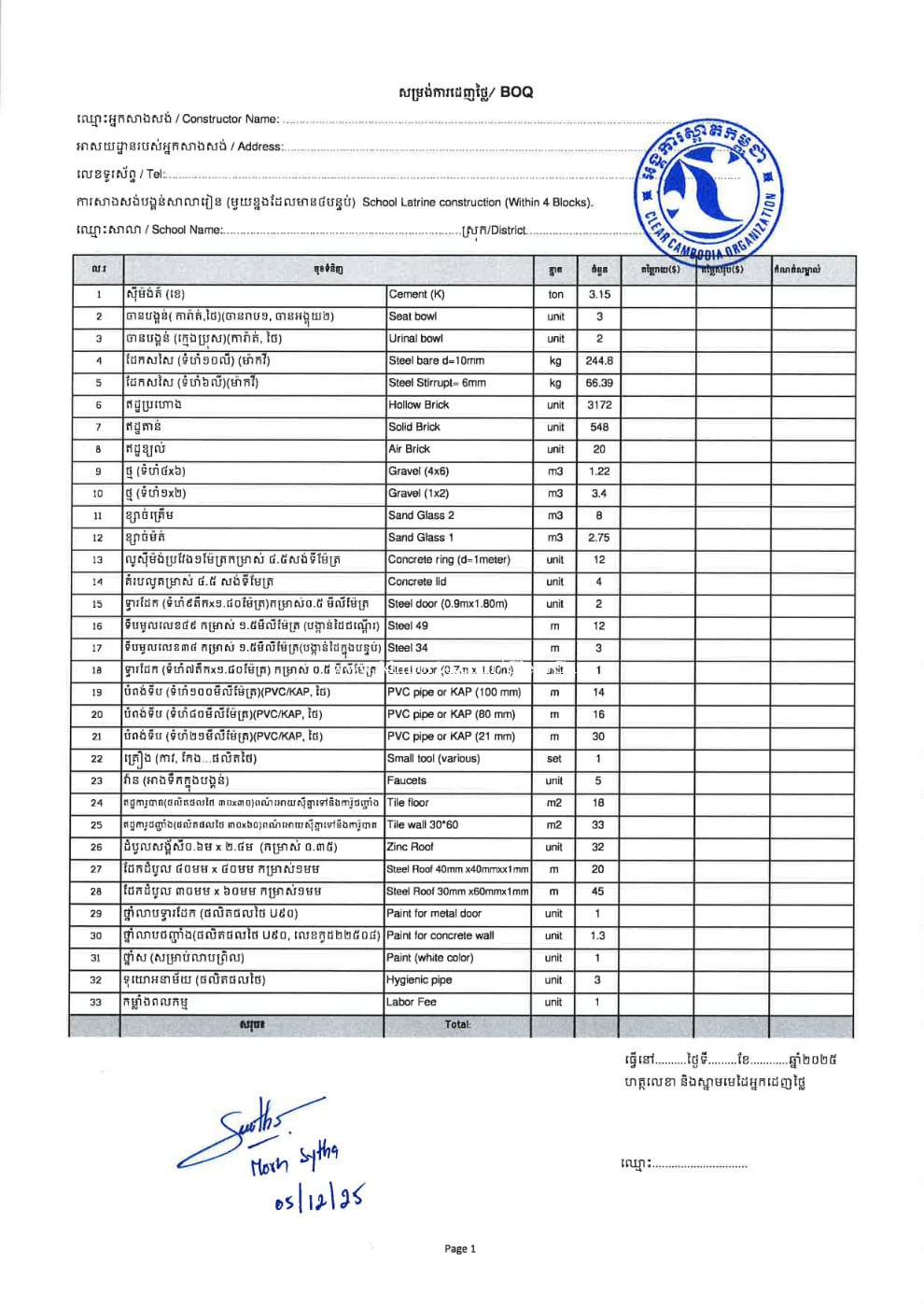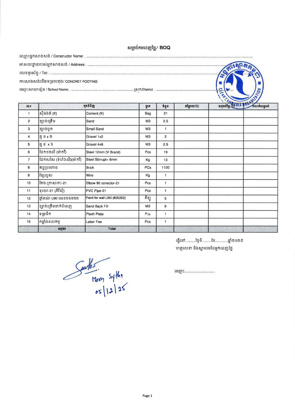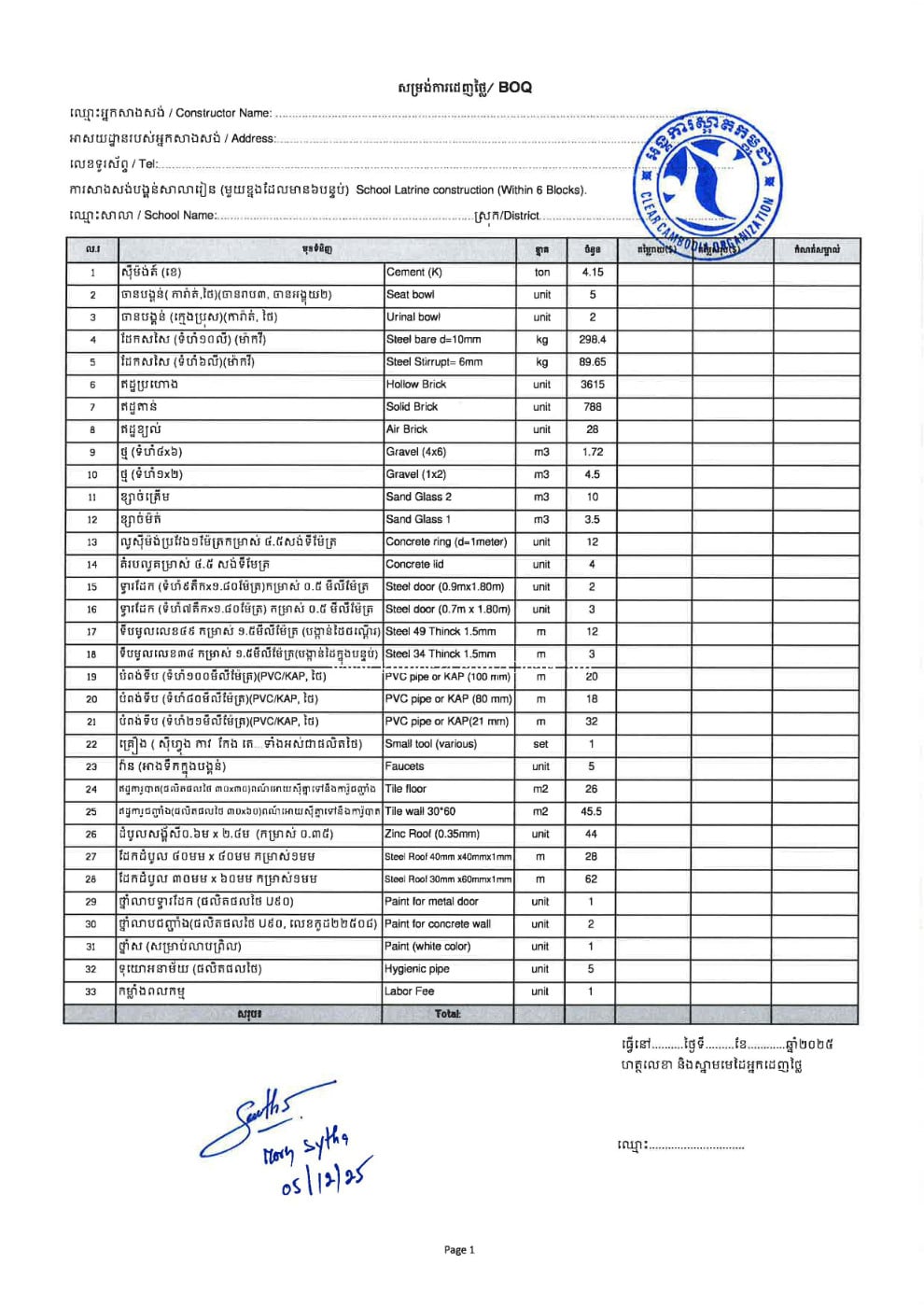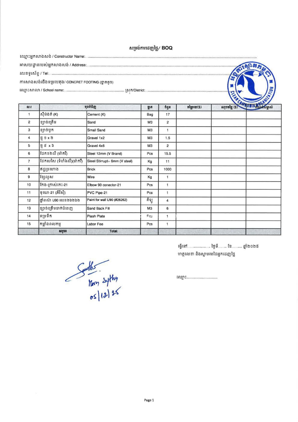 អង្គការស្អាតកម្ពុជា៖ គឺជាអង្គការក្នុងស្រុកមួយដែលធ្វើការលើវិស័យអភិវឌ្ឍន៍នៅក្នុងសហគមន៍ដោយលើកកម្ពស់គុណភាពទឹកអនាម័យសុខភាព និងជីវភាពរស់នៅរបស់ប្រជាពលរដ្ឋដោយប្រើបច្ចេកវិទ្យា និងការអប់រំសមស្រប។ អង្គការស្អាតកម្ពុជា ត្រូវការស្វែងរក និងជ្រើសរើសជាងសាងសង់បង្គន់អនាម័យ តាមសាលារៀន, ជើងទម្រ, និងកន្លែងលាងដៃ ក្នុងឆ្នាំ២០២៦ នេះដើម្បីចូលរួមការដេញថ្លៃសាងសង់នៅតាមបណ្ដាខេត្តដូចខាងក្រោម៖ ១. ខេត្តបាត់ដំបង (ស្រុកសង្កែ ស្រុកបវេល និងស្រុកបាណន់ ) បង្គន់អនាម័យសាលារៀន (៦បន្ទប់មានចំនួន២ខ្នង, ៥បន្ទប់មានចំនួន២ខ្នង, ៤បន្ទប់មានចំនួន៨ខ្នង, និង៣បន្ទប់មានចំនួន៩ខ្នង) ជើងទម្រ និងកន្លែងលាងដៃមានចំនួន៣១ (សាមសិបមួយ) ២. ខេត្តព្រៃវែង (ស្រុកស៊ីធរកណ្ដាល និងស្រុកពាមជរ) បង្គន់អនាម័យសាលារៀន(៦បន្ទប់មានចំនួន១ខ្នង, ៥បន្ទប់មានចំនួន២ខ្នង, ៤បន្ទប់មាន៥ខ្នង និង៣បន្ទប់មានចំនួន១៣ខ្នង) ជើងទម្រ និងកន្លែងលាងដៃមានចំនួន៣១ (សាមសិបមួយ) ៣. ខេត្តត្បូងឃ្មុំ (ស្រុកមេមត់ ស្រុកពញាក្រែក និងស្រុកតំបែរ) បង្គន់អនាម័យសាលារៀន(៦បន្ទប់មានចំនួន១ខ្នង, ៥បន្ទប់មាន១ខ្នង, ៤បន្ទប់មាន៥ខ្នង និង៣បន្ទប់មានចំនួន១៤ខ្នង) ជើងទម្រ និងកន្លែងលាងដៃចំនួន៣១ (សាមសិបមួយ) ៤. ខេត្តសៀមរាប (ស្រុកស្រីស្នំ និងស្រុកវ៉ារិន) បង្គន់អនាម័យសាលារៀន (៦បន្ទប់មានចំនួន២ខ្នង ៥បន្ទប់មានចំនួន២ខ្នង ៤បន្ទប់មាន៦ខ្នង និង៣បន្ទប់មានចំនួន១១ខ្នង) ជើងទម្រ និងកន្លែងលាងដៃចំនួន៣១ (សាមសិបមួយ) ៥. ខេត្តកំពង់ស្ពឺ (ស្រុកសំរោងទង និងស្រុកគងពិសី) បង្គន់អនាម័យសាលារៀន (៦បន្ទប់មានចំនួន១ខ្នង ៥បន្ទប់មានចំនួន២ខ្នង ៤បន្ទប់មានចំនួន៥ខ្នង និង៣បន្ទប់មានចំនួន១៣ខ្នង) ជើងទម្រ និងកន្លែងលាងដៃចំនួន៣១ (សាមសិបមួយ) លក្ខខណ្ឌនៃការជ្រើសរើស៖ 1) ជាជាងសាងសង់ដោយផ្ទាល់ និងជាជាងដែលមានបទពិសោធន៍ក្នុងការសាងសង់បង្គន់អនាម័យ កន្លែងលាងដៃ និងជើងទម្រ ទៅតាមស្តង់ដានៃសំណង និងតាមប្លង់គម្រូរបស់អង្គការស្អាតកម្ពុជាដែលបានផ្ដល់ជូន។ 2) ការដាក់ដេញថ្លៃមកអង្គការស្អាតកម្ពុជាត្រូវតែមិនមែនជាសាច់ញាតិនឹងគ្នា ឬក្រុមជាងតែមួយឡើយ។ ឧទាហរណ៍ៈ ឪពុក និងកូន ជាងនៅក្នុងក្រុមតែមួយដេញថ្លៃផ្សេងគ្នា និងដាក់ដេញតម្លៃផ្សេងគ្នា ក្នុងខណៈអ្នកដែលត្រូវបានជ្រើសរើស និងអ្នកដែលមិនត្រូវបានជ្រើសរើសមកសាងសង់ក្នុងក្រុមអ្នកដែលបានជ្រើសរើស។ 3) បុគ្គលិក រឺបុគ្គលិកស្ម័គ្រចិត្តរបស់អង្គការស្អាតកម្ពុជាមិនត្រូវបានអនុញ្ញាតិអោយដាក់ដេញថ្លៃឡើយ។ កំណត់សំគាល់៖ គ្រប់ផលិតផលរបស់អង្គការស្អាតកម្ពុជាខាងលើ នៅក្នុងខេត្តគោលដៅជ្រើសរើសក្នុងជាងតែ១ក្រុមប៉ុណ្ណោះ។ អាស្រ័យដូចបានជំរាបជូនខាងលើសូមលោក លោកស្រីដែលមានចំណាប់អារម្មណ៏ក