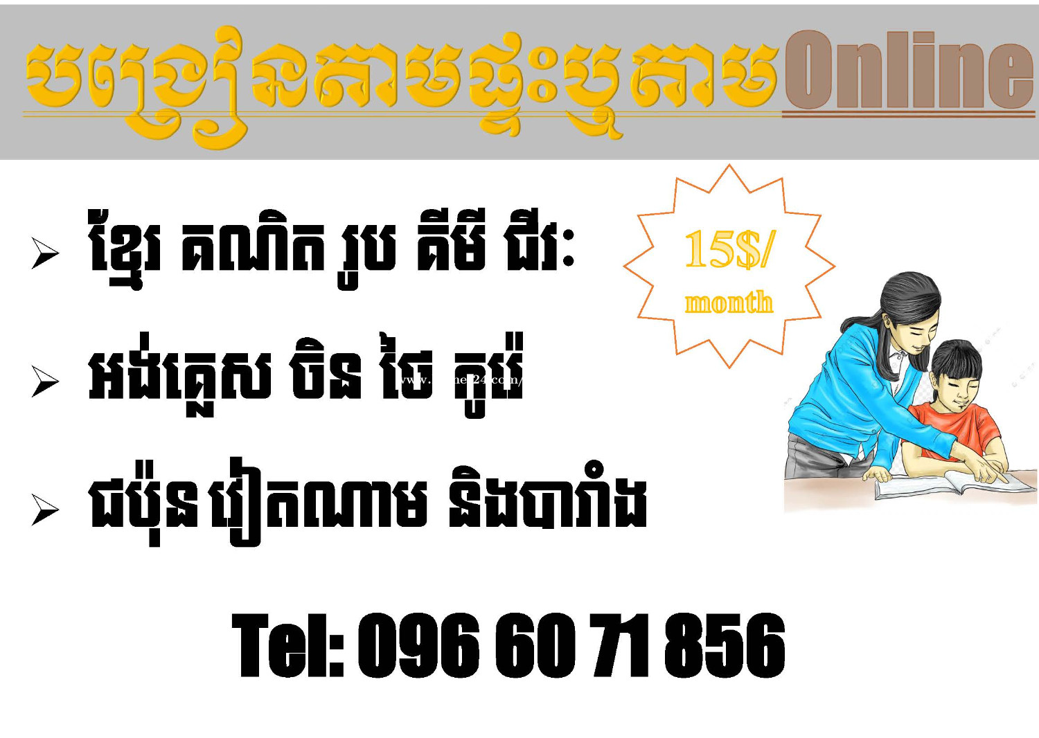 សេវាកម្មបង្រៀនដល់ផ្ទះយើងខ្ញុំមានទទួលបង្រៀនគ្រប់មុខវិជ្ជាដូចជា៖ -ខ្មែរ គណិត រូប គីមី ជីវៈ -អង់គ្លេស ចិន ថៃ កូរ៉េ ជប៉ុន រៀតណាម និងបារាំង -កុំព្យូទ័រ គ្រប់វគ្គ Tel:0966071xxxClick To Call