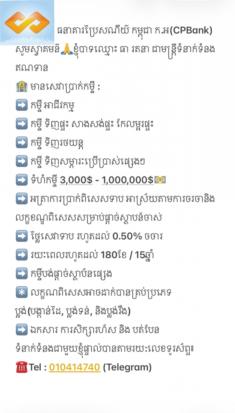 សូមជំរាបសួរអ៊ុំពូមីងបងប្អូន បើមានបំណងត្រូវការប្រាក់💵💵កម្ចី បន្ថែមទុនឬពង្រីចអាជីវកម្មតូចធំ /ទិញផ្ទះ ទទួលបានរយៈពេលវែង ទិញយានយន្ត និងឧបករណ៍ប្រើប្រាស់ផ្សេងៗ សូមទាក់ទងមកលេខខ្ញុំបាទមន្រ្តីសេវាកម្មប្រាក់កម្ចី 👉🏻👉🏾010414xxxClick To Call (telegram)🙏🏻