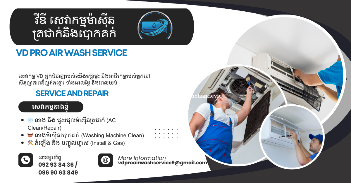 ស្វាគមន៍មកកាន់ VD PRO AIR WASH SERVICE! យើងខ្ញុំផ្តល់សេវាកម្មប្រកបដោយទំនុកចិត្ត និងវិជ្ជាជីវៈខ្ពស់។ 🛠 សេវាកម្មរបស់យើងខ្ញុំរួមមាន៖ ❄️ លាងម៉ាស៊ីនត្រជាក់ (AC Cleaning): បាញ់លាងសម្អាតកម្ចាត់ធូលី និងមេរោគ ជួយឱ្យត្រជាក់ខ្លាំង និងសន្សំសំចៃភ្លើង។ 🛠 ជួសជុល (Repair): ជួសជុលគ្រប់បញ្ហា ម៉ាស៊ីនមិនត្រជាក់ ហៀរទឹក ឬមានសំឡេងរំខាន។ 🌬 បញ្ចូលហ្គាស (Refill Gas): បញ្ចូលហ្គាសគ្រប់ប្រភេទ ដើម្បីឱ្យម៉ាស៊ីនដើរពេញអានុភាព។ 🧺 លាងម៉ាស៊ីនបោកគក់: លាងសម្អាតធុងខាងក្នុង កម្ចាត់ក្អែល និងក្លិនមិនល្អ។ 🎁 Promotion ពិសេសខែនេះ៖ បញ្ចុះតម្លៃពិសេសសម្រាប់ការលាងចាប់ពី ៣ គ្រឿងឡើងទៅ។ ឥតគិតថ្លៃ៖ ពិនិត្យស្ថានភាពម៉ាស៊ីន និងកម្រិតហ្គាសជូនអតិថិជន។ ហេតុអ្វីគួរជ្រើសរើសយើងខ្ញុំ? ✅ ក្រុមជាងមានជំនាញច្បាស់លាស់ និងបទពិសោធន៍យូរឆ្នាំ។ ✅ សេវាកម្មរហ័សទាន់ចិត្ត ទៅដល់ទីតាំងទាំងយប់ទាំងថ្ងៃ។ ✅ តម្លៃសមរម្យ និងមានការធានាត្រឹមត្រូវលើការងារ។ 📍 តំបន់សេវាកម្ម៖ រាជធានីភ្នំពេញ និងតំបន់ជុំវិញ។ 📞 ផ្នែកលក់ និងសេវាកម្មអតិថិជន៖ 092938xxxClick To Call (Cellcard) 0969063xxxClick To Call (Smart) 📧 Email: vdp*****************@gmail.comClick To Sent Email