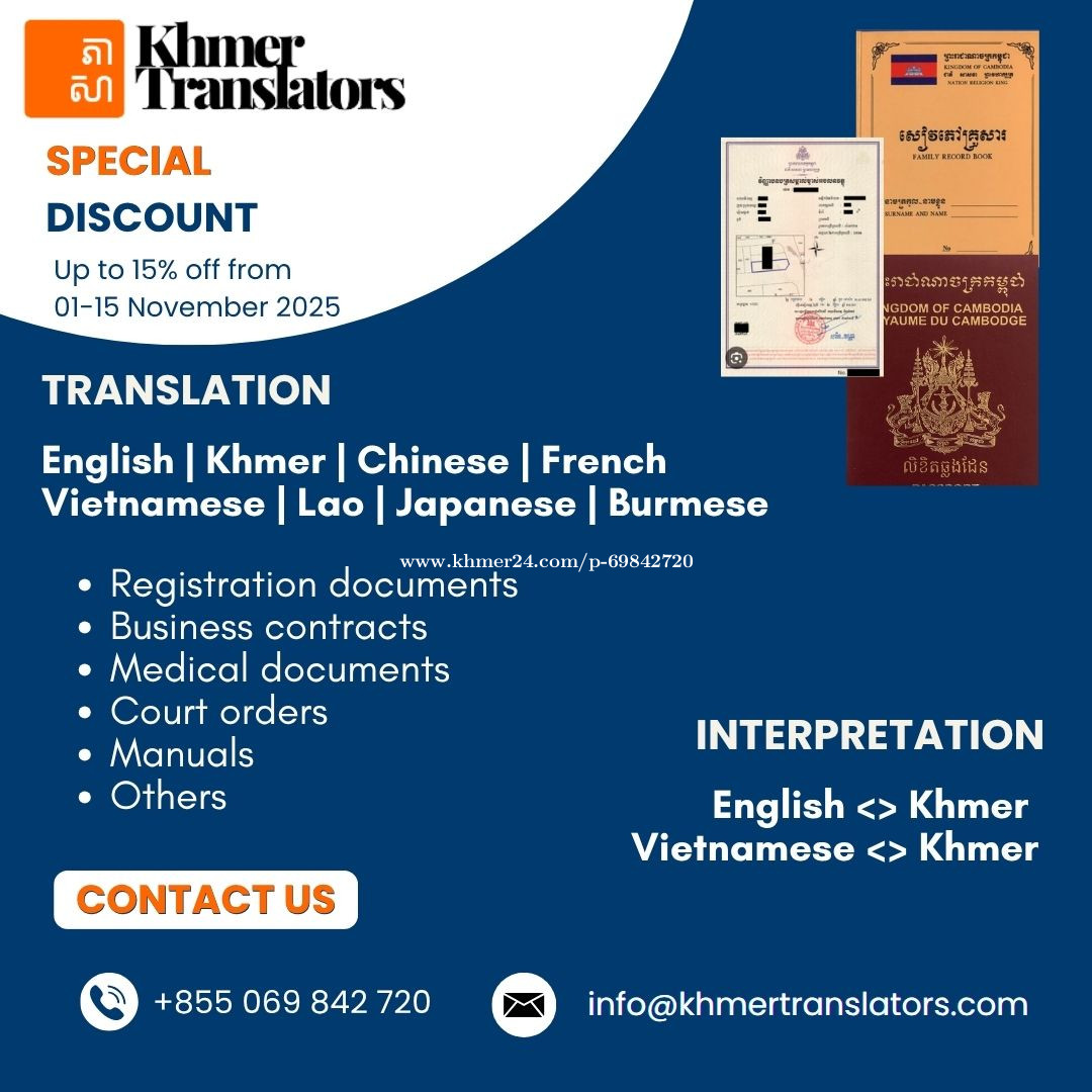 ក្រុមហ៊ុន Khmer Translators ផ្ដល់ជូនការបញ្ចុះតម្លៃសម្រាប់ការបកប្រែឯកសារជាច្រើនប្រភេទសម្រាប់ #ភាសាអង់គ្លេស #ខ្មែរ #ចិន #វៀតណាម #ជប៉ុន #ឡាវ #និងភូមា នៅក្នុងឱកាសអបអរសាទរព្រះរាជពិធីបុណ្យអុំទូក បណ្ដែតប្រទីប និងសំពះព្រះខែ អកអំបុកពីថ្ងៃទី ០៤-០៦ ខែវិច្ឆិកា ឆ្នាំ ២០២៥។ 📚 តើលោកអ្នករៀបចំបកប្រែឯកសារទៅសិក្សានៅបរទេសមែនទេ? ព្រឹត្តិបត្រពិន្ទុ សញ្ញាបត្រ និងឯកសារផ្សេងទៀត Are you preparing to translate documents for studying abroad? Transcripts, diplomas, and other related documents 🏠 តើលោកអ្នកត្រូវការបកប្រែកិច្ចសន្យាមែនទេ? កិច្ចសន្យាអាជីវកម្ម ការជួលដី ឬការជួលផ្ទះ និងកិច្ចសន្យាផ្សេងៗទៀត Do you need contract translations? Business contracts, land leases, house rentals, and other agreements ✈️តើលោកអ្នកកំពុងរៀបចំបកប្រែឯកសារដាក់ទៅស្ថានទូត ដើម្បីធ្វើដំណើរទៅកម្សាន្តនៅក្រៅប្រទេសមែនទេ? លិខិតឆ្លងដែន អត្តសញ្ញាណបណ្ណ សៀវភៅគ្រួសារ សំបុត្រកំណើត និងឯកសារផ្សេងៗទៀត Are you arranging document translations for embassy submissions to travel abroad for leisure? Passports, ID cards, family books, birth certificates, and other documents 📖តើលោកអ្នកត្រូវការបកប្រែសៀវភៅដែរឬទេ? សៀវភៅណែនាំប្រើប្រាស់ទោចក្រយានយន្ត សៀវភៅធានារ៉ាប់រង សៀវភៅអប់រំ និងសៀវភៅផ្សេងៗទៀត Do you need book translations as well? Motorcycle user manuals, insurance booklets, educational books, and others ⚕️តើលោកអ្នកត្រូវការបកប្រែឯកសារវេជ្ជសាស្ត្រ និងឯកសារច្បាប់មែនទេ? វិក្កយបត្រពេទ្យ ពាក្យសុំច្បាប់ ពាក្យបណ្តឹង និងឯកសារផ្សេងៗទៀត Do you require medical and legal document translations? Medical certificates, license applications, complaints, and other related documents 🗣 តើលោកអ្នកត្រូវការសេវាបកប្រែផ្ទាល់មាត់មែនទេ? Do you need interpretation services for both conferences and field meetings? ក្រុមហ៊ុន Khmer Translators អាចជួយលោកអ្នកបានជាមួយនឹងតម្លៃសមរម្យ និងប្រកបដោយទំនួលខុសត្រូវ។ សូមទាក់មកយើងខ្ញុំតាមទំនាក់ទំនងខាងក្រោម៖ Tel: +8556984xxxClick To Call0 Email: inf*@khmertranslators.comClick To Sent Email Telegram: https://t.me/khmertranslators WhatsApp: +8556984xxxClick To Call0 Website: www.khmertranslators.com