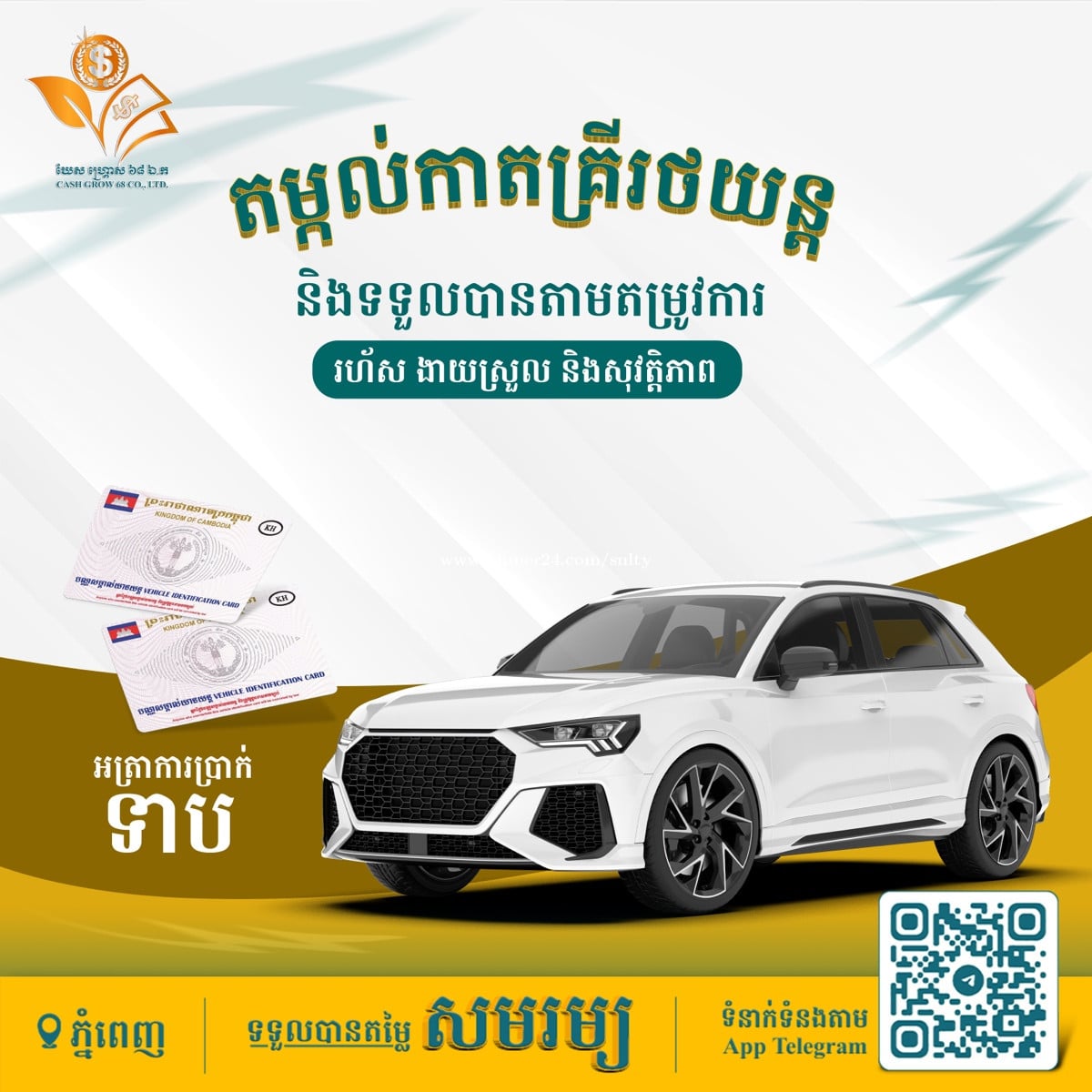 ក្រុមហ៊ុន បញ្ចាំស្របច្បាប់ ឃែសហ្គ្រោស៦៨ ឯ.ក ដែរមានអាជ្ញាប័ណ្ណពីក្រសួងត្រឹមត្រូវ ខាងយើងមានទទួលបញ្ចាំ ម៉ូតូរថយន្ត នឹងឯកសាររថយន្តគ្រប់ប្រភេទ គ្រឿងអេឡិចត្រូនិចគ្រឿងអលង្ការ ជាមួយការ ប្រាក់សមរម្យ ទទួលបានតម្រូវការខ្ពស់ នឹងសុវត្ថិភាពខ្ពស់ជូនលោកអ្នក💯 សម្រាប់ពត៌មានលម្អិត ☎️0889280xxxClick To Call / 077977xxxClick To Call / 016737xxxClick To Call