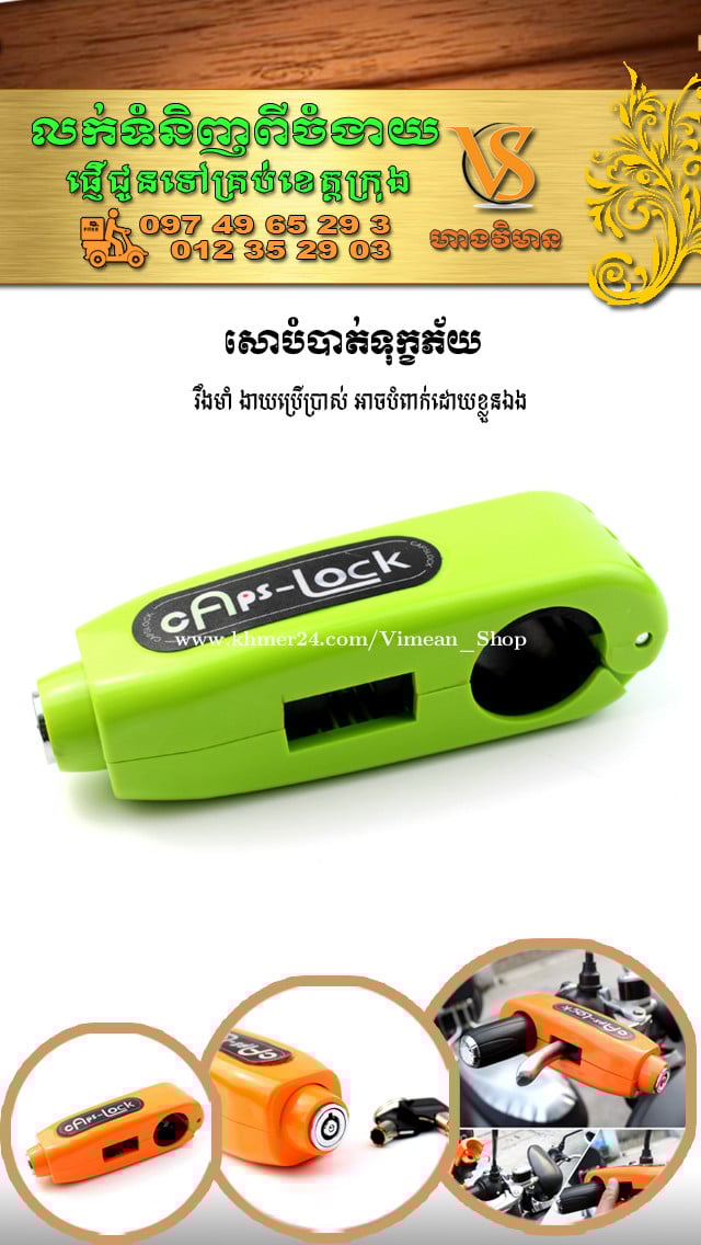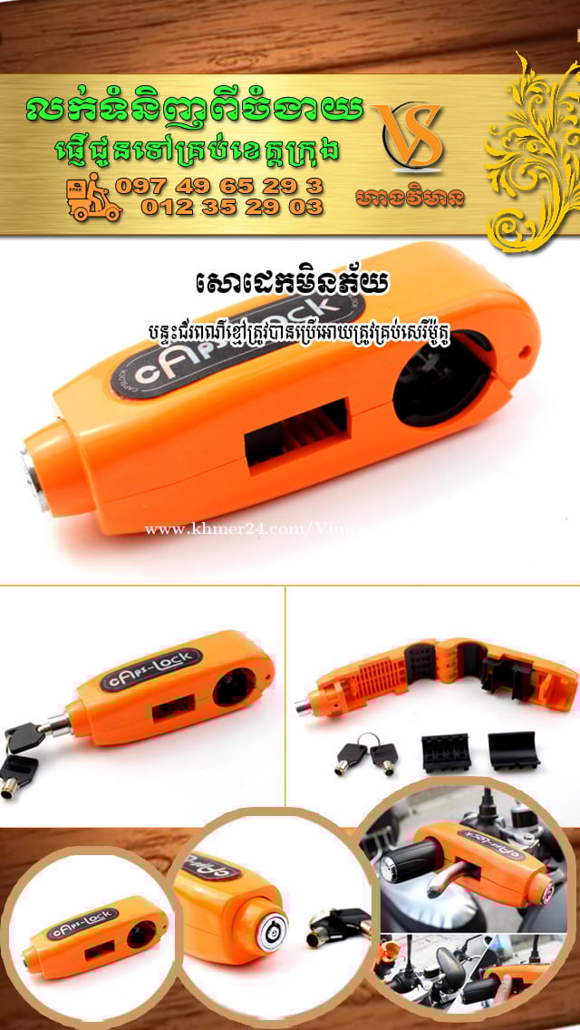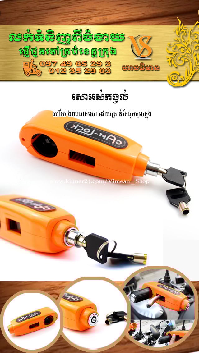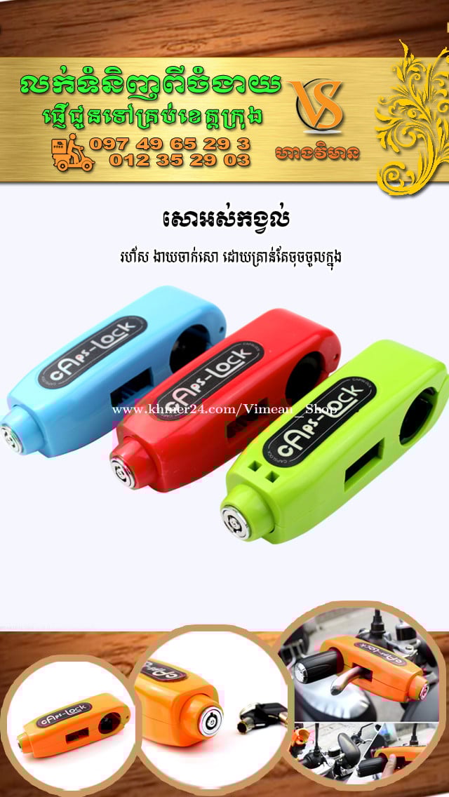 លក់សោចាក់ម៉ូតូ សោចាក់ការពារចោរលួច សោដើម្បីសុវត្ថិភាព សោដេកមិនភ័យ សោអស់កង្វល់ សោការពារការស្តាយក្រោយ សោបំបាត់ទុក្ខភ័យ។ មានសេវាផ្ញើជូនគ្រប់ខេត្តក្រុង។ ទស្សនាវីដេអូ របៀបប្រើប្រាស់ជាក់ស្តែង៖ https://fb.watch/bvUy8fbiEy/ កម៉្មង់តាមMessenger៖ http://m.me/RemoteShopping Tel: 012352xxxClick To Call (Cellcard) / 097496xxxClick To Call 3 (Metfone) / 087362xxxClick To Call (Smart) Address៖ ផ្ទះ G21, ផ្លូវ Goody, សង្កាត់ទឹកថ្លា, ខណ្ឌសែនសុខ, រាជធានីភ្នំពេញ ( ក្នុងបូរីនៃផ្សាររតនាផ្លាហ្សា1 ឬ ម្តុំស្ពានអាកាសផ្សារដីហ៊ុយ ) --------------- សោចាក់ម៉ូតូ សោសុវត្ថិភាព សោការពារចោរលួច ចាក់ហ្វ្រ័ងម៉ូតូ ចាក់សោ សោម៉ូតូ សោការពារម៉ូតូ ម៉ូតូ Motorcycle Lock, Lock, Bike Lock, Locker, Scooter, minibike, Dream, Honda, Yamaha, PCX, Scoppy, Beat, Honda Dream, Honda XADV, Honda CT, Honda CRF, Honda SupperCub, Honda ADV, Honda CB, Honda Click,