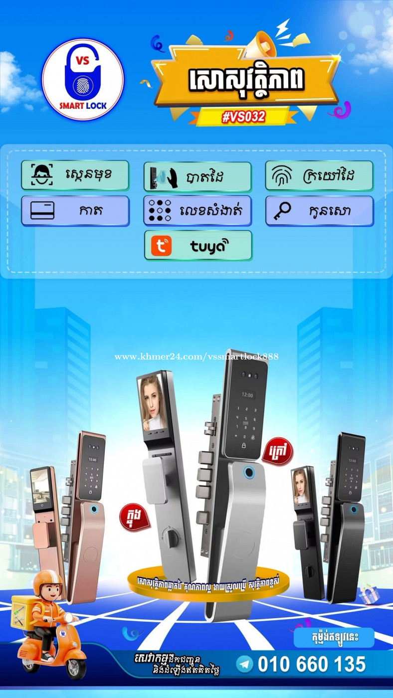 🔐 សោសុវត្ថិភាពឆ្លាតវៃ_ទំនើបទាន់សម័យ 💰 តម្លៃសមរម្យ គុណភាពល្អ សុវត្ថិភាពខ្ពស់ 🔓 អាចបើកសោតាមរយៈ 👉🏻 ស្កេនមុខ 😊 👉🏻 ស្កេនបាតដៃ 👋 👉🏻 ស្កេនក្រយៅដៃ 👍 👉🏻 លេខកូដសំងាត់ 🔢 👉🏻 ស្កេនកាត 💳 👉🏻 ប្រើ App ក្នុងទូរស័ព្ទដៃ 👉🏻 និងកូនសោចាក់ 🔑 🪛🛠 អាចដំឡើងបានលើទ្វារឈើគ្រប់ប្រភេទ ទ្វារPVC ទ្វារMC ទ្វារកញ្ចក់ស៊ុមដែក(ស៊ុមញូម) ទ្វារសុវត្ថិភាព -ល- សម្រាប់ព័ត៌មានបន្ថែមសូមទំនាក់ទំនង៖ តេឡេក្រាម:https://t.me/vssmartlock888
