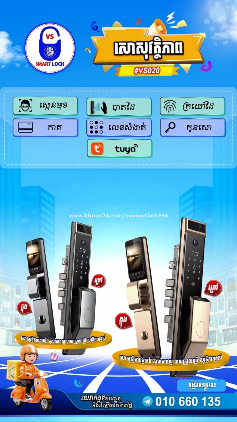 🔐 សោសុវត្ថិភាពឆ្លាតវៃ_ទំនើបទាន់សម័យ 💰 តម្លៃសមរម្យ គុណភាពល្អ សុវត្ថិភាពខ្ពស់ 🔓 អាចបើកសោតាមរយៈ 👉🏻 ស្កេនមុខ 😊 👉🏻 ស្កេនបាតដៃ 👋 👉🏻 ស្កេនក្រយៅដៃ 👍 👉🏻 លេខកូដសំងាត់ 🔢 👉🏻 ស្កេនកាត 💳 👉🏻 ប្រើ App ក្នុងទូរស័ព្ទដៃ 👉🏻 និងកូនសោចាក់ 🔑 🪛🛠 អាចដំឡើងបានលើទ្វារឈើគ្រប់ប្រភេទ ទ្វារPVC ទ្វារMC ទ្វារកញ្ចក់ស៊ុមដែក(ស៊ុមញូម) ទ្វារសុវត្ថិភាព -ល- សម្រាប់ព័ត៌មានបន្ថែមសូមទំនាក់ទំនង៖ តេឡេក្រាម:https://t.me/vssmartlock888