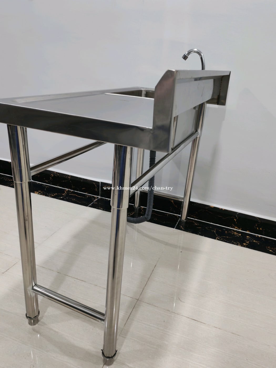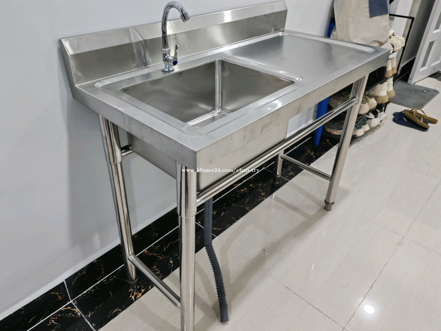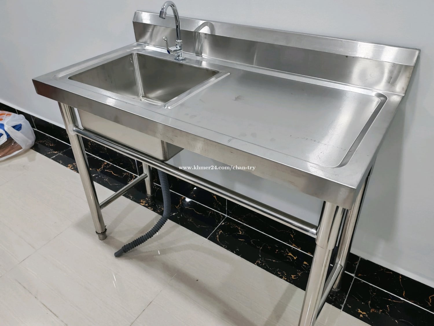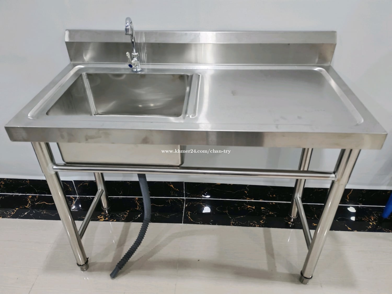 ឈុតស៊ីងលាងចានអ៊ីណុក មានក្បាលរុំមីនេ ទុយោទឹកមួយឈុតពេញ ឡាប៊ូលាងចានអ៊ីណុកថ្មី បណ្ដោយ 1m ទទឹង 0.5m កំពស់ 0.75m