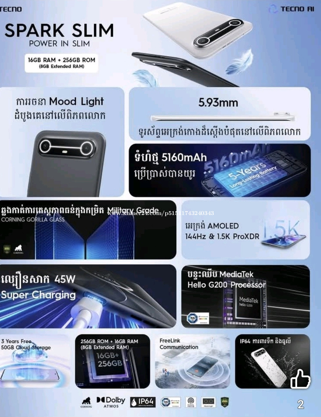 Spark Slim កំពូលស្តើង - Ram8+256GB តម្លៃ 249$ 🎉លក់226$🎉 😱ការរចនារូបរាងស្តើង កំលាំងថ្មធំ ការប្រើប្រាស់បានយូរ កម្រាស់ត្រឹមតែ 5.93mm ល្អឥតខ្ចោះ! ✨អេក្រង់6.78'' ប្រភេទអេក្រង់កោង លឿនអេក្រង់144Hz 1.5K AMOLED ✨ប្រភេទអេក្រង់ធន់ Corning Gorilla Glass 7i ✨កម្រិតពន្លឺ 4500nit ✨បន្ទះឈីប Helio G200 ✨កាមេរ៉ាគោល 50MP+2MP ✨កាមេរ៉ាមុខ 13Mp ✨កាមេរ៉ាក្រោយមានភ្លើងLED ✨ថ្ម5160mAh (ល្បឿនសាកថ្ម45W) ✨ស្គេនក្រយ៉ៅដៃលើកញ្ចក់អេក្រង់ ✨បំពាក់មុខងារ FreeLink ✨Speaker Dobly Atmos 2គ្រាប់ ✨មានការពារជម្រាបទឹកIP64 ✨បច្ចេកវិទ្យាAIសំបូរបែប (Image,Wallpaper, Eraser, Ella, Noise Reduce) 🟣 មាន2ពណ៌៖ ⚫️Black ⚪️White 🎁 កាដូថែមជូនមាន : Free Case Free Sceen Freeកាបូបស្ពាយ 🫶Free ដឹកជញ្ជូន 25ខេត្តក្រុង 🫶 មានបោះដុំតំលៃល្អតាមទីផ្សា ☎️លេខទូរសព្ទទំនាក់ទំនងពត៌មានបន្ថែមសូមឆាត Cellcard 077675xxxClick To Call Smart 087675xxxClick To Call Telegram t.me/Neth99097❤️ ✅️ 🔊 ទីតាំងផ្លូវ 143 សង្កាត់បឹងកេងកង3 ភ្នំពេញ Map📌 https://maps.app.goo.gl/SQyz2rBm5FNbjYhv5. #sparkslim #TECNOMobile