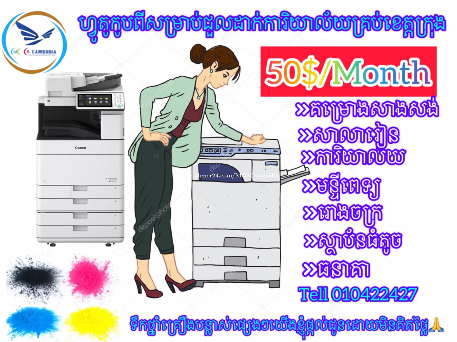 *ការផ្តល់ជូន ពីការជួលហ្វូតូកូបពី * មានម៉ាស៊ីនហ្វូតូកូបពី១គ្រឿង (តាមតម្រូវការ ) * ក្នុង១ខែអាចប្រើប្រាស់បាន 2500ផេក * កូបពី ព្រី កូល័រ)A3,A4,A5 * ដឹកជញ្ជូប ដល់ទីតាំង (ហ្វ្រី) * IT តម្លើងព្រីនស្កែន( ហ្វ្រី) * ទឹកថ្នាំ គ្រឿងបន្លាស់ផ្សេងៗ (ហ្វ្រីគ្រប់មុខ) * បញ្ចុះតម្លៃ50%(តម្លៃដើមខែទី១) * សូមបញ្ចាក់ថា ក្រដាស់សម្រាប់ព្រីនឯកសារ ខាងយើងមិនផ្តល់ជូនទេ