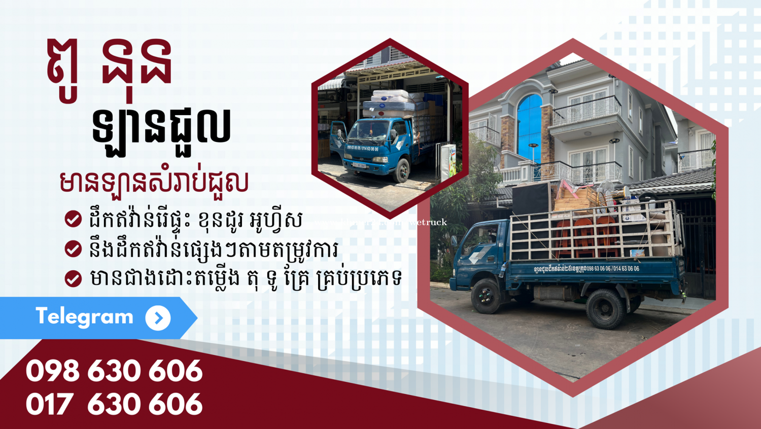 មានឡានសម្រាប់ជួលដឹកឥវ៉ាន់ រើផ្ទះ ខុនដូរ អូហ្វីស ឬ ដឹកឥវ៉ាន់ផ្សេងៗតាមតម្រូវការ។ Tel 098630xxxClick To Call 017630xxxClick To Call Telegram t.me/wetruck24 We have large and medium trucks for rent to move goods, move houses, move offices, and other materials, and transport them to 25 provinces and cities.