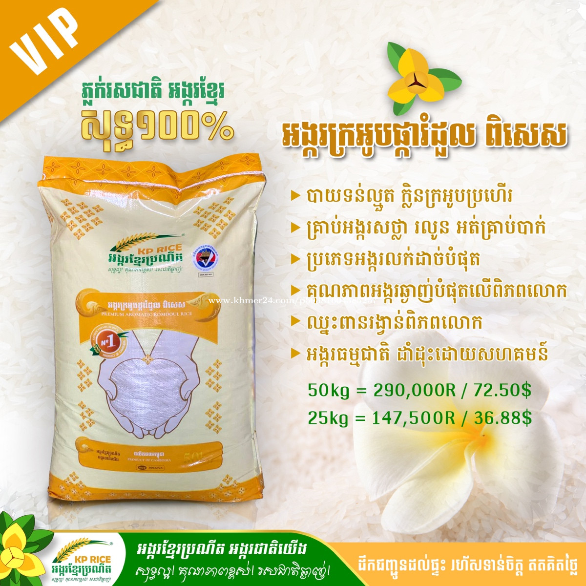 អង្ករក្រអូបផ្ការំដួលពិសេស •បាយទន់ល្មួត ក្លិនក្រអូបប្រហើរ •គ្រាប់អង្ករសថ្លា រលូន អត់បាក់គ្រាប់ •ប្រភេទអង្ករលក់ដាច់បំផុត •គុណភាពអង្ករឆ្ងាញ់បំផុតលើពិភពលោក •ឈ្នះពានរង្វាន់ពិភពលោក •អង្ករធម្មជាតិ ដាំដុះដោយសហគមន៍