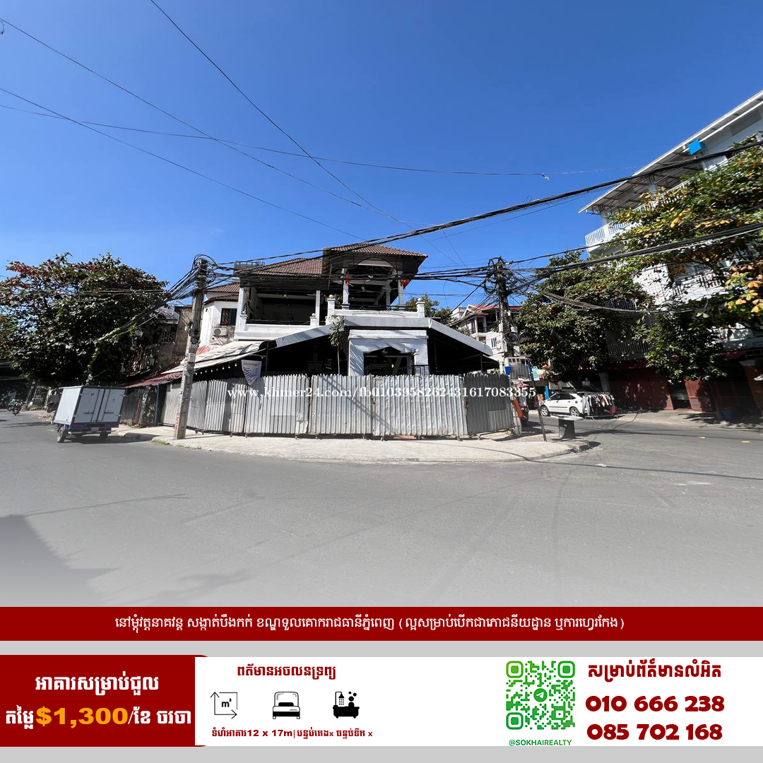 អាគារកែងសម្រាប់ជួល ស្ថិតម្តុំវត្តនាគវន្ត ********************** តម្លៃជួលRent Price $1,300/month ◈━━━━━━━━━━━━◈ ទំហំដីLand Size: 12m x 17m ទំហំឃ្លាំងW- Size: 12m x 18m បន្ទប់គេងBedroom: x បន្ទប់ទឹកBathroom:x 📍ទីតាំងស្ថិននៅ សង្កាត់បឹងកក់ ខណ្ឌទួលគោក ភ្នំពេញ ◈━━━━━━━━━━━━◈ 📍សូមចូលទៅកាន់𝗧𝗲𝗹𝗲𝗴𝗿𝗮𝗺 𝗖𝗵𝗮𝗻𝗻𝗲𝗹ពេលនេះ ដើម្បីស្វែងរកអចលនទ្រព្យពិសេសផ្សេងទៀត៖ 🔗 𝐓𝐞𝐥𝐞. 𝐂𝐡𝐚𝐧𝐧𝐞𝐥:𝗵𝘁𝘁𝗽𝘀://𝘁.𝗺𝗲/𝗦𝗼𝗸𝗵𝗮𝗶𝗥𝗲𝗮𝗹𝘁𝘆 ☎️ 𝗧𝗲𝗹𝗲𝗴𝗿𝗮𝗺:𝟬𝟭𝟬 𝟲𝟲𝟲 𝟮𝟯𝟴 ☎️ 𝗧𝗲𝗹𝗲𝗴𝗿𝗮𝗺:𝟬𝟴𝟱 𝟳𝟬𝟮 𝟭𝟲𝟴