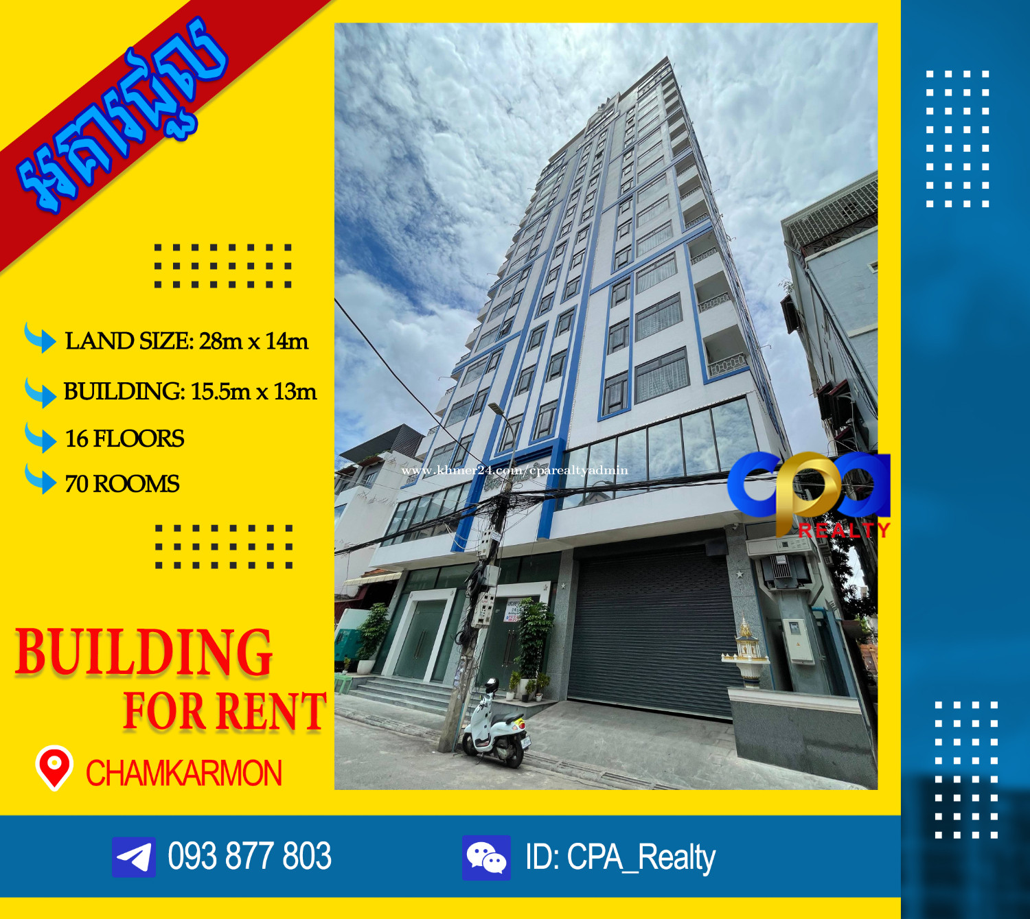 ⭕️ អាគារជួលនៅខណ្ឌចំការមន 🆔 03406 💢 ទំហំដី: 28m x 14m 💢 ទំហំអាគារ: 15.5m x 13m 💢 តម្លៃជួល: $32,000/ខែ ចរចារ 💢 អាគារកំពស់ ១៦ ជាន់, ការិយាល័យ ១ ជាន់ និងមានអាងហែលទឹក 💢 មាន ៧០ បន្ទប់, សម្ភារៈពេញ ☎️ 𝟎𝟗𝟑 𝟖𝟕𝟕 𝟖𝟎𝟑 𝙩𝙚𝙡𝙚𝙜𝙧𝙖𝙢: https://t.me/cparealtors 𝙬𝙚𝙘𝙝𝙖𝙩 𝙄𝘿: CPA_Realty 𝙩𝙚𝙡𝙚𝙜𝙧𝙖𝙢 𝙘𝙝𝙖𝙣𝙣𝙚𝙡: https://t.me/cparealty