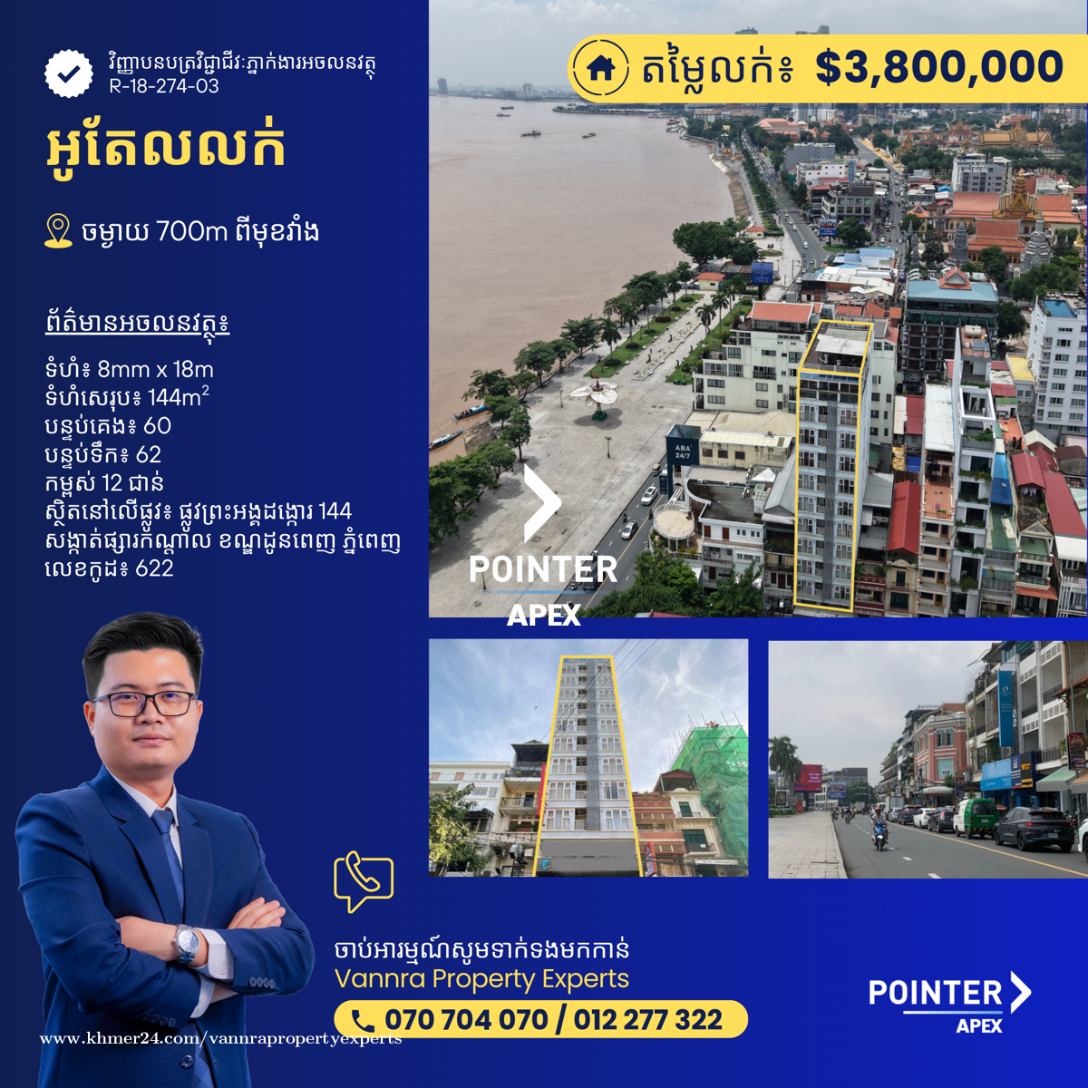 អូតែលសម្រាប់លក់ ទីតាំងល្អជិតព្រះបរមរាជវាំង សម្រាប់លក់: $ 3,800,000 ទំហំដី: 8m x 18m (144m2) ទំហំអូតែល: 7.8m x 17.5m បន្ទប់គេង: 60 បន្ទប់ បន្ទប់ទឹក: 62 បន្ទប់ 🔐លេខកូដអចលនវត្ថុ៖ 622 📌 លើផ្លូវព្រះអង្គដង្កោរ 144 ខណ្ឌ ដូនពេញ ភ្នំពេញ ——————————— ទាក់ទងមកឥលូវនេះ៖ Call: 070704xxxClick To Call / 012277xxxClick To Call Telegram: https://t.me/vannraaa 微信号: vannra-experts - Channel: https://t.me/vannrapropertyexperts - Tiktok: https://www.tiktok.com/@vannra_property_experts - Facebook: https://www.facebook.com/vannra.phnompenh.property/