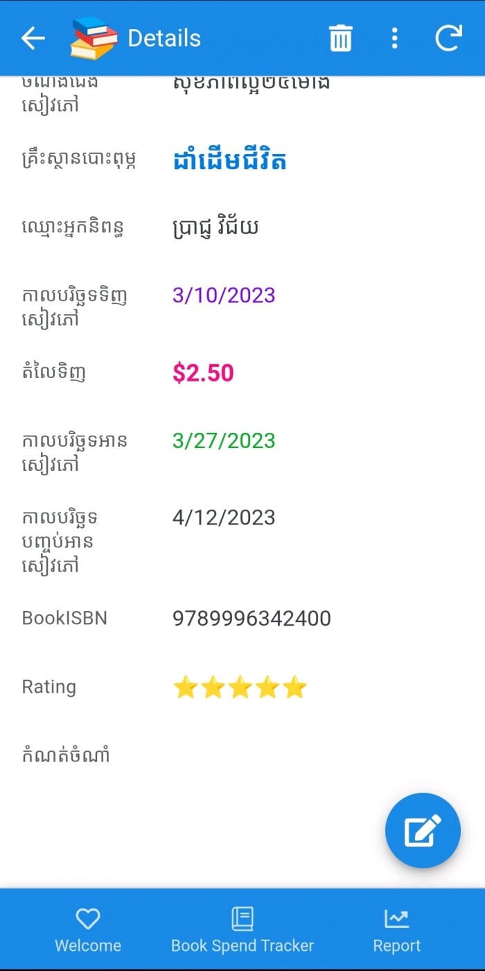 សំរាប់អ្នកចូលចិត្តអានសៀវភៅ!!! 👉តើលោកអ្នកធ្លាប់ទិញសៀវភៅផ្ទួនគ្នាជាច្រើនក្បាលដែរឬទេ? 👉តើលោកអ្នកចង់ដឹងថាក្នុងមួយឆ្នាំៗ ចំនាយលុយប៉ុន្មានសំរាប់ការទិញសៀវភៅ? 👉👉👉មានអេបគ្រប់គ្រងប្រវត្តិនៃការទិញសៀវភៅនិងការអានសៀវភៅ អាចជួយលោកអ្នកបាន។ ប្រើមិនមានភាពស្មុគស្មាញ!!! 👉តំលៃអេបមួយនេះត្រឹមតែ ១០០០០០ រៀល ស្មើនឹង ២៥ ដុល្លារ តែប៉ុណ្ណោះ 👉Contact with me : https://t.me/makara2018 👉លោកអ្នកអាចគ្រប់គ្រងទិន្ន័យបានដោយខ្លួនឯង