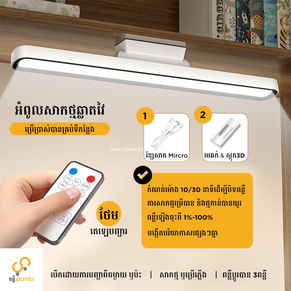 ប្រេីប្រាស់បានគ្រប់ទីកន្លែង 1.កំណត់ម៉ោង 10/30 នាទីដើម្បីបិទពន្លឺ 2.ការសាកថ្មប្រើបាន និងថ្មកាន់បានយូរ 3. ពន្លឺឡេីងចុះពី 1%-100% 4. បង្កើតបរិយាកាសផ្សេងៗគ្នា