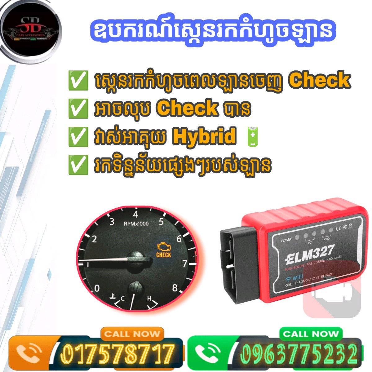 ឡានចេញ Check មែនទេឈប់បារម្មណ៍ទៀតទៅ! នេះជាឧបករណ៍សំរាប់ឆែកមើលរាល់បញ្ហាឡានចេញCheckទាំងអស់ លោកអ្នកគ្រាន់តែមានឧបករណ៏នេះដាក់ជាប់ក្នុងឡាននឹងអស់ក្តីបារម្មណ៏ពីដំណើរតាមខេត្ត ឬផ្លូវឆ្ងាយ យើងអាចឆែកមើលបានគ្រប់ពេលដោយភ្ជាប់ជាមួយទូរស័ព្ទ Smart Phone (Android និង IOS) សំរាប់ពិនិត្យមើលបានជាច្រើនមាន: - ឆែកមើលពេលឡានចេញ Check (Check Engine) - អាចលុបCheckបាន (Clear Fault Codes) - ពិនិត្យវុលអាគុយ Hybrids (Toyota Prius) - បញ្ហាផ្សេងៗជាច្រើនទៀត តម្លៃត្រឹមតែ 10$ សេវាដឹក1.5$ គ្រប់25ខេត្ត/ក្រុង Free កម្មវិធី Full Version និង Video របៀបប្រើប្រាស់ឧបករណ៏ Telegram 017578xxxClick To Call
