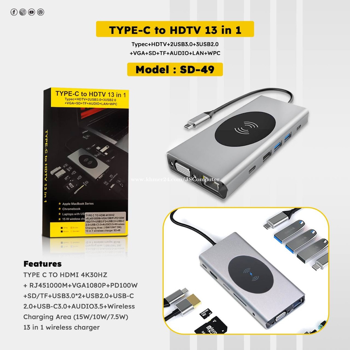 Key Features: It typically includes ports for HDMI, VGA, USB 3.0, USB 2.0, Ethernet (RJ45), SD/TF card readers, a 3.5mm audio jack, and a USB-C PD port for charging. Wireless Charging: The device features a wireless charging area that supports various charging powers (e.g., 5W, 7.5W, 10W, 15W). Compatibility: It is compatible with a variety of devices, including Apple MacBook series, Chromebooks, and other laptops with a USB-C port. Video Output: The hub supports high-definition video output, with HDMI at 4K resolution and VGA at 1080P.