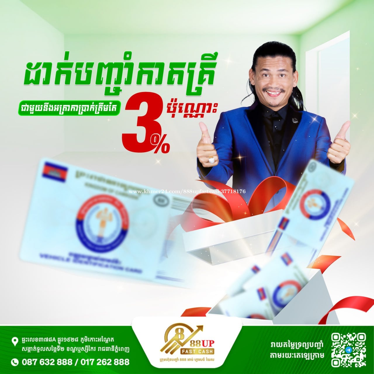 [English & 中文 Below ] ⚡️ ទទួលបញ្ចាំកាតគ្រីរថយន្ត គ្រប់ប្រភេទ! 🔥 ពិសេស! អត្រាការប្រាក់ត្រឹមតែ 3% 😍 💡 ងាយស្រួល! លឿនរហ័សទាន់ចិត្ត! ---------------------------------- ⚡️ We accept all types of Car Title/Registration Cards for pawning! 🔥 Special! Interest rate is only 3%! 😍 💡 Easy! Fast and instant speed! ---------------------------------- ⚡️ 接受所有类型的汽车产权证典当! 🔥 特别优惠!利率仅 3%! 😍 💡 简单!快速便捷! 📌អាសយដ្ឋាន/Address: House 378A, St. 1928, Koh Andet Village, Toul Sangke 2 Commune, Russey Keo District, Phnom Penh. 📍ទីតាំងហាង/Location : GOOGLE MAP (https://maps.app.goo.gl/UevdooDbTrA78jtH8) 📲ព័ត៌មានបន្ថែម/More info click here : CHANNEL (https://t.me/x888UpFastCashChannel) 📈វាយតម្លៃចុចទីនេះ/Quick assessment click here: TELEGRAM (https://t.me/x888upfashcash) 🌐Website: 888UPFC.COM ☎️ Tel : 087632xxxClick To Call / 017262xxxClick To Call #PawnShop #888UpFastCash #PawnShopCambodia #LowInterestRate
