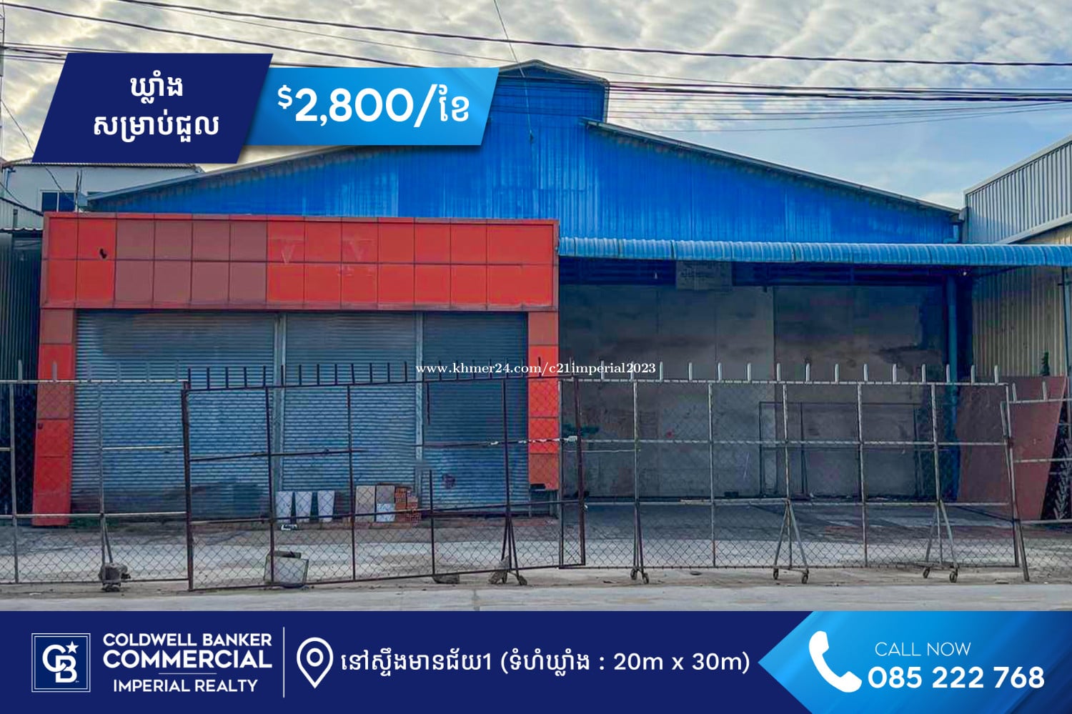 -តម្លៃជួល : 2,800 ដុល្លារ/ខែ -ទំហំឃ្លាំង : 20ម*30ម -កុងត្រា : 3ឆ្នាំ -កក់ : 4ខែ ✨ លក្ខណពិសេស នៅលេីផ្លូវធំ អ៊ូអរ អាចធ្វើជាហាងគ្រឿងសំណង់ ឬឃ្លាំងស្តុកទំនិញ។ ✉️សម្រាប់ព័ត៌មានលំអិត និងរូបភាពបន្ថែមសូមទំនាក់ទំនងៈ ☎️085222xxxClick To Call | 069993xxxClick To Call 🔗Telegram : https://t.me/imperialcomercial 🌐Website : https://imperialrealty.com.kh