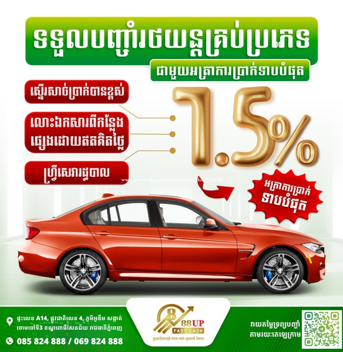 [English & 中文 Below ] ✨ទទួលបញ្ចាំរថយន្តគ្រប់ប្រភេទ អត្រាការប្រាក់ត្រឹមតែ 1.5% ✅ អនុម័តលឿន ✅ សេវាបញ្ចាំងាយស្រួល ✅ រក្សាការសម្ងាត់ជូនអតិថិជន ---------------------------------- ✨ We accept pawning of all types of cars, with an interest rate of only 1.5%. ✅ Fast approval. ✅ Easy pawn service. ✅ Customer confidentiality is maintained/assured. ---------------------------------- ✨ 接受所有类型汽车典当,利率仅 1.5%。 ✅ 快速审批。 ✅ 典当服务简单方便。 ✅ 为客户保密。 📌អាសយដ្ឋាន/Address: House No. A14, National Road No. 4, Ou Derm Village, Chamchao 3 Sangkat, Pou Senchey District, Phnom Penh. 📍ទីតាំងហាង/Location : GOOGLE MAP (https://maps.app.goo.gl/vamdC6Cv753fG5Wb8?g_st=atm) 📲ព័ត៌មានបន្ថែម/More info click here : CHANNEL (https://t.me/cc888upfastcashchannel) 📈វាយតម្លៃចុចទីនេះ/Quick assessment click here: TELEGRAM (https://t.me/cc888upfastcash) 🌐Website: 888UPFC.COM ☎️ Tel : 069824xxxClick To Call / 085824xxxClick To Call #888UpFastCash #888UpFastCashCC #LowInterestRate