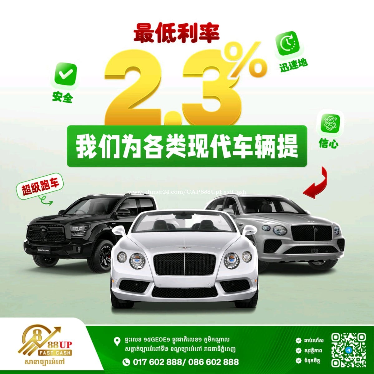 [English & 中文 Below ] ✨ ទទួលបញ្ចាំរថយន្តទំនើប អត្រាការប្រាក់ពិសេស! ត្រឹមតែ 2.3% ប៉ុណ្ណោះ! ✨ ✅ លក្ខណៈពិសេសនៃការបញ្ចាំ: ងាយស្រួល និងរហ័សទាន់ចិត្ត ✅ ធានា សុវត្ថិភាព ទ្រព្យសម្បត្តិខ្ពស់ ✅ អនុម័តឆាប់រហ័ស និងទំនុកចិត្ត ---------------------------------- ✨ Luxury Car Pawning Service Special Interest Rate! Only 2.3%! ✨ ✅ Key Features of Our Pawning Service: Easy and instant process ✅ Guaranteed high security for your asset ✅ Fast approval and highly reliable service ---------------------------------- ✨ 豪车典当服务 特惠利率! 仅 2.3%! ✨ ✅ 典当服务特点: 轻松快捷,即时办理 ✅ 保证资产高度安全 ✅ 快速审批,值得信赖 📌អាសយដ្ឋាន/Address: House 15GEOE1, National Road 1, Kandal Village, Chbar Ampov2 Commune, Chbar Ampov District, Phnom Penh. 📍ទីតាំងហាង/Location : GOOGLE MAP 📲ព័ត៌មានបន្ថែម/More info click here : CHANNEL 📈វាយតម្លៃចុចទីនេះ/Quick assessment click here: TELEGRAM 🌐Website: 888UPFC.COM ☎️ Tel : 017602xxxClick To Call / 086602xxxClick To Call #PawnShop #888UpFastCash #PawnShopFinds #LowInterestRate