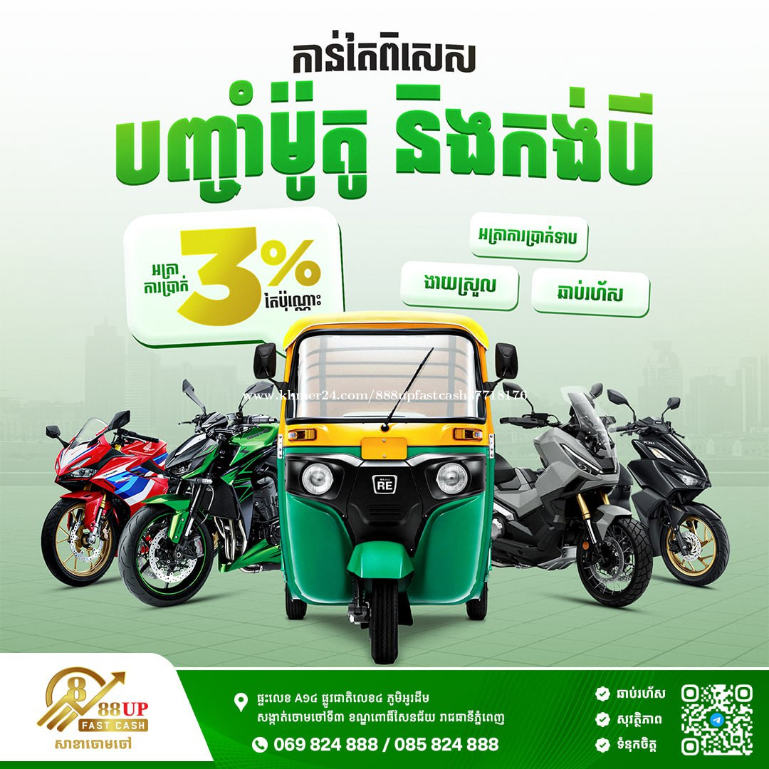 [English & 中文 Below ] ✨ បញ្ចាំម៉ូតូ និងកង់បីគ្រប់សេរី ✅ សេវាបញ្ចាំលឿន រហ័ស និងងាយស្រួល ✅ សុវត្ថិភាពទុកចិត្តបាន 100% ✅ អត្រាការប្រាក់ទាបត្រឹមតែ 3% ប៉ុណ្ណោះ! 😍 ---------------------------------- ✨ Pawn all models of motorbikes and tuk-tuks ✅ Fast, quick, and easy pawning service. ✅ 100% trustworthy and secure. ✅ Low interest rate of only 3%! 😍 ---------------------------------- ✨ 典当所有型号的摩托车和嘟嘟车 ✅ 快速便捷的典当服务。 ✅ 安全100% 客户保密 ✅ 低利率仅 3%!😍 📌អាសយដ្ឋាន/Address: House No. A14, National Road No. 4, Ou Derm Village, Chamchao 3 Sangkat, Pou Senchey District, Phnom Penh. 📍ទីតាំងហាង/Location : GOOGLE MAP (https://maps.app.goo.gl/nB5FmGCngYg1qwmg8) 📲ព័ត៌មានបន្ថែម/More info click here : CHANNEL (https://t.me/cc888upfastcashchannel) 📈វាយតម្លៃចុចទីនេះ/Quick assessment click here: TELEGRAM (https://t.me/cc888upfastcash) 🌐Website: 888UPFC.COM ☎️ Tel : 069824xxxClick To Call / 085824xxxClick To Call #PawnShop #888UpFastCash #PawnShopFinds #LowInterestRate