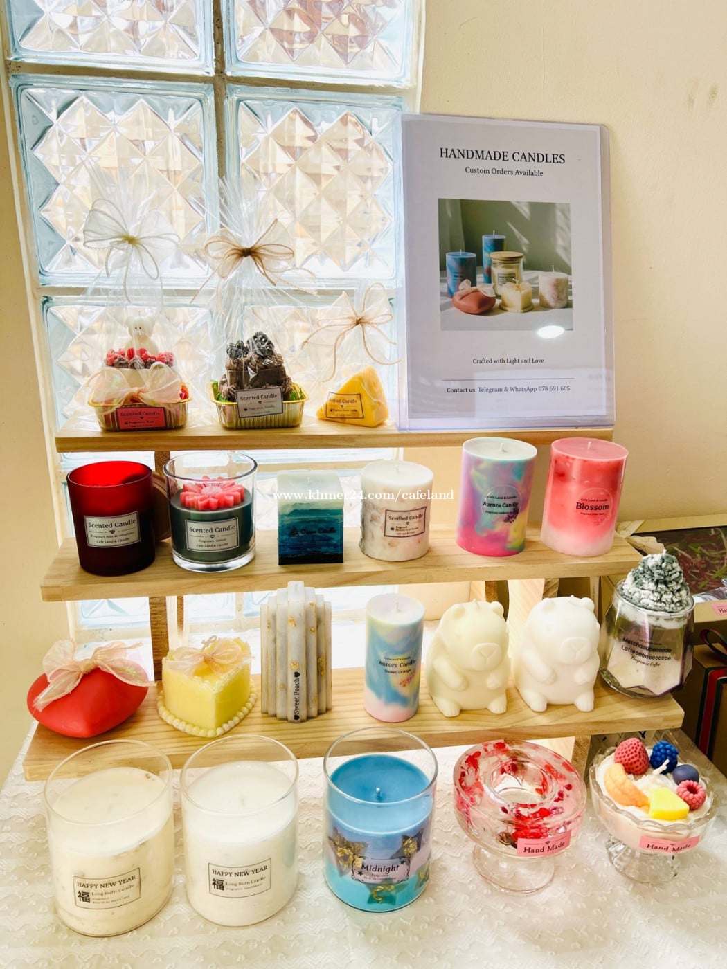 ✨ កម្រងទៀនធ្វើដោយដៃ ✨ សមស្របសម្រាប់ជាអំណោយ ឬតុបតែងផ្ទះ 🎁 អាចបញ្ជាទិញតាមការរចនា ឬក្លិនដែលអ្នកពេញចិត្តបាន ❤️ សម្រាប់ការសួរនានា Telegram: 078691xxxClick To Call 📍Cafe Land & Candle Location https://maps.app.goo.gl/JQH2GoVpBJFqZP4s7?g_st=com.google.maps.preview.copy 🩷 ENG_translation ✨ Handmade Candle Collection ✨ Perfect for gifts or home decoration 🎁 Custom orders are available based on your preferred design or scent. ❤️ Telegram & Whatsapp: 078691xxxClick To Call 📍Cafe Land & Candle Location https://maps.app.goo.gl/JQH2GoVpBJFqZP4s7?g_st=com.google.maps.preview.copy
