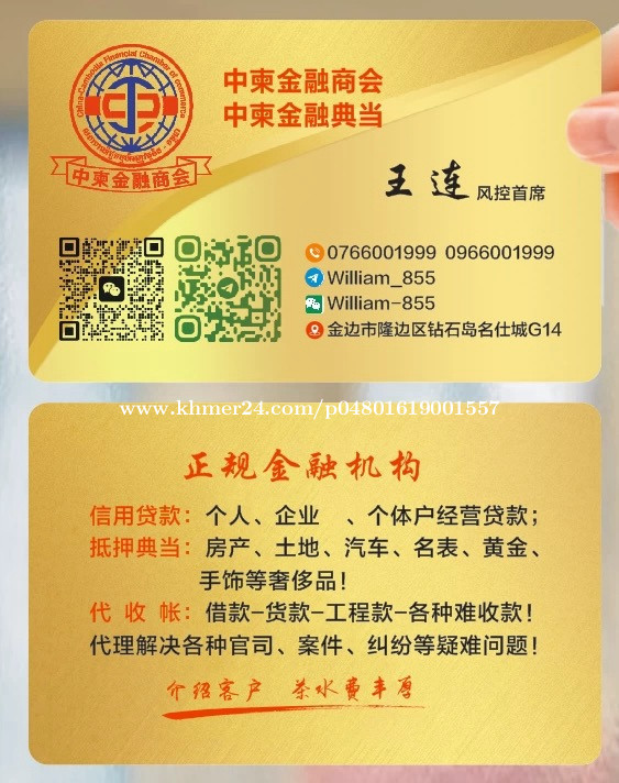 中柬金融商会 中柬金融典当 王连 风控首席CRO ☎️:0979588xxxClick To Call 0966001xxxClick To Call ✈️:@William_855 微信:William-855 地址:金边市隆边区钻石岛名仕城G14 金融贷款服务: 信用贷款:个人、企业 、个体户经营贷款; 抵押典当:房产、土地、汽车、名表、黄金、手饰等奢侈品! 代 收 帐:借款-货款-工程款-各种难收款! 代理解决各种官司、案件、纠纷等疑难问题!