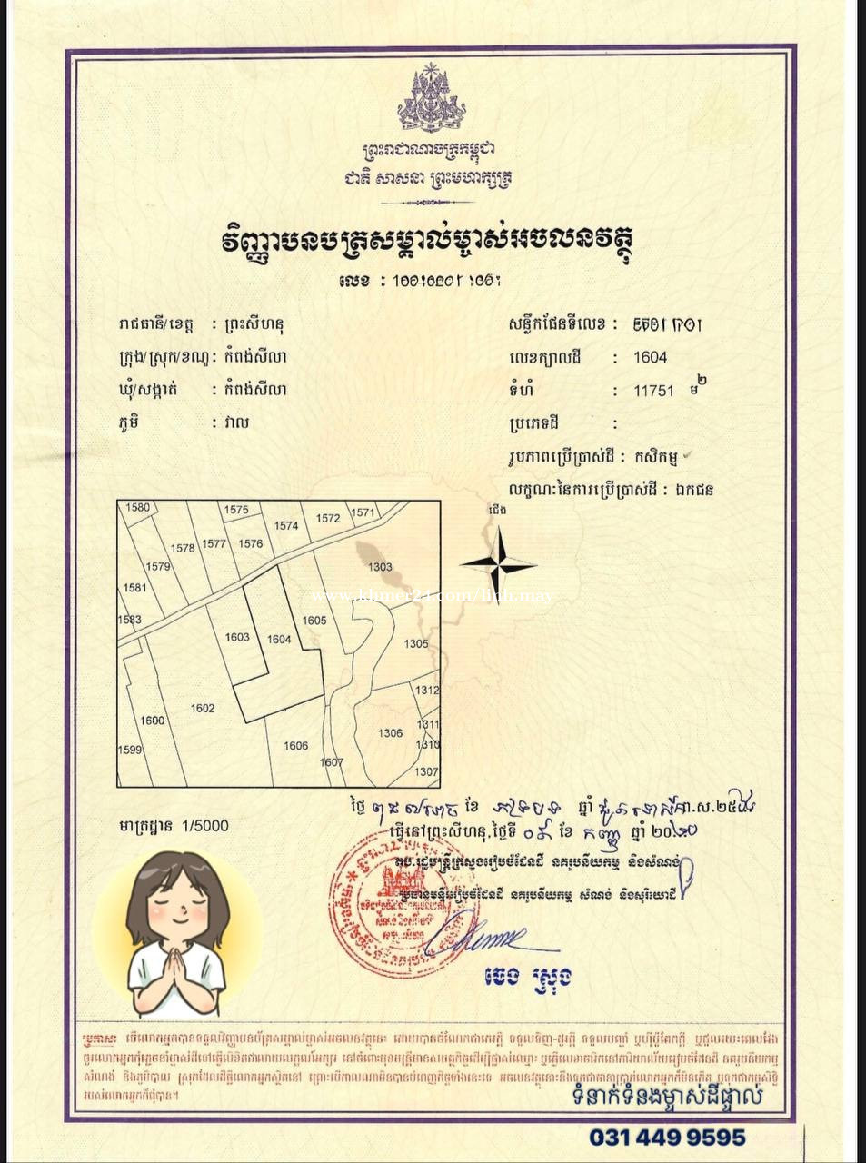 តម្លៃ (ចចារបាន) 出售土地 : $12/m2 土地面积:11751平方米 位置:西哈努克省 磅思蜡